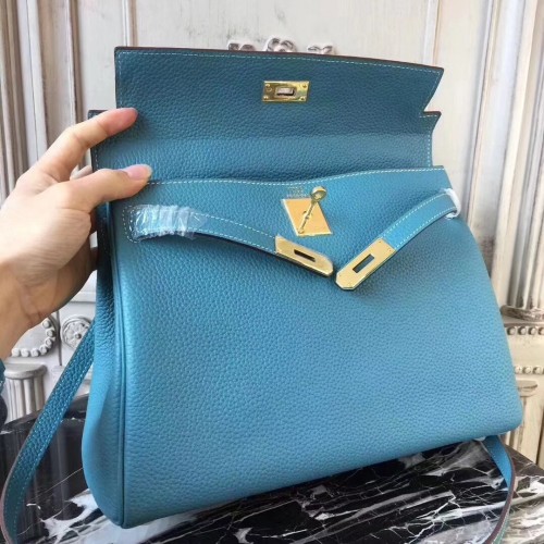 Hermes Blue Lin Clemence Kelly 32cm Retourne Bag