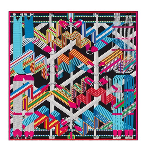 Among the many books preserved in the Émile Hermès collectsion are the albums of Camille et fils, a Parisian saddler based in the 10th arrondissement. A plate dating from 1895 illustrating a selection of girths caught the attention of Virginie Jamin, who was attracted by the restrained beauty of the drawing. The designer, a specialist in geometric compositions, gave free rein to her imagination, deploying the girth motif in a playful zigzag pattern. In an elegant and fascinating dance, the girths mirror each other as they criss‑cross or zigzag in a harmonious mix of lines, checks and coloured weaves.