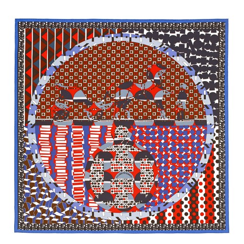 An ex-libris is a vignette engraved with a motif, a phrase or initials, which book-lovers stick in their books in order to personalise them. The ex-libris of Émile Hermès, grandson of the Parisian house’s founder, takes its inspiration from a drawing by the French painter Alfred de Dreux, featuring a groom and carriage, synonymous with the romantic era of Paris. The image draws strength from its simplicity, and has been interpreted numerous times over the years. In this scarf, the illustrator Louis Boquin dresses it in motifs normally used for silk ties, in a play of geometrical lines juxtaposing circles, squares, triangles and letters.
