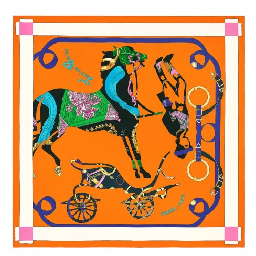 The symbol of the house of Hermès, our Ex-libris (bookplate) is inspired by a late 19th-century painting in the Emile Hermès collectsion, deconstructed here by designer Bali Barret. The motifs are filled with details from past carrés. This design was first issued in 2006.