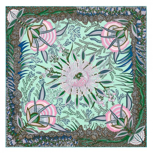 The strange, South African protea flower has become a national symbol, flourishing at the heart of the fynbos, a mountainous, coastal ecosystem of exceptional biodiversity, benefiting from the Mediterranean climate of the Western Cape. Enshrined majestically at the centre of this carré, in a fresh interpretation of a traditional, stylised design, the bloom evokes the signature ceramics produced by the Ardmore collectsive, the creative force behind this striking composition.