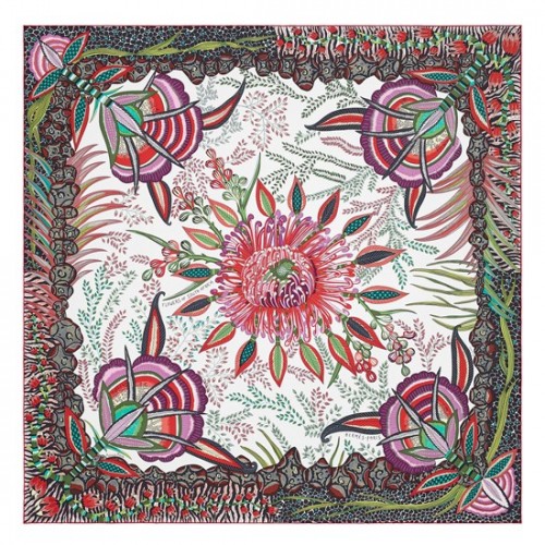 The strange, South African protea flower has become a national symbol, flourishing at the heart of the fynbos, a mountainous, coastal ecosystem of exceptional biodiversity, benefiting from the Mediterranean climate of the Western Cape. Enshrined majestically at the centre of this carré, in a fresh interpretation of a traditional, stylised design, the bloom evokes the signature ceramics produced by the Ardmore collectsive, the creative force behind this striking composition.