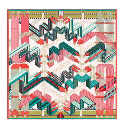 Among the many books preserved in the Émile Hermès collectsion are the albums of Camille et fils, a Parisian saddler based in the 10th arrondissement. A plate dating from 1895 illustrating a selection of girths caught the attention of Virginie Jamin, who was attracted by the restrained beauty of the drawing. The designer, a specialist in geometric compositions, gave free rein to her imagination, deploying the girth motif in a playful zigzag pattern. In an elegant and fascinating dance, the girths mirror each other as they criss‑cross or zigzag in a harmonious mix of lines, checks and coloured weaves.