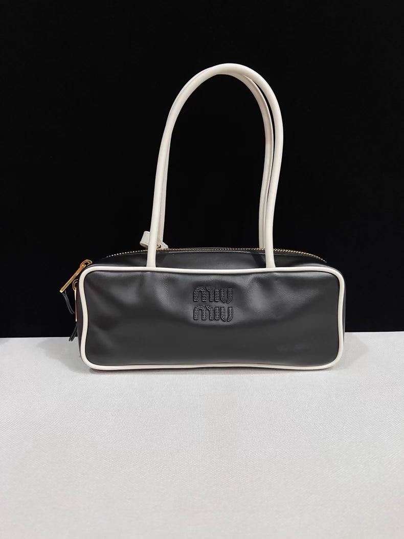 A striking Miu Miu shoulder bag in classic black and white, measuring 28×10×8cm. This medium-sized silhouette balances everyday practicality with refined aesthetics, showcasing the house's signature color-blocking design. In good condition, it retains its structured form and polished hardware. An elegant accessory that elevates both casual and formal wardrobes with understated Italian luxury.