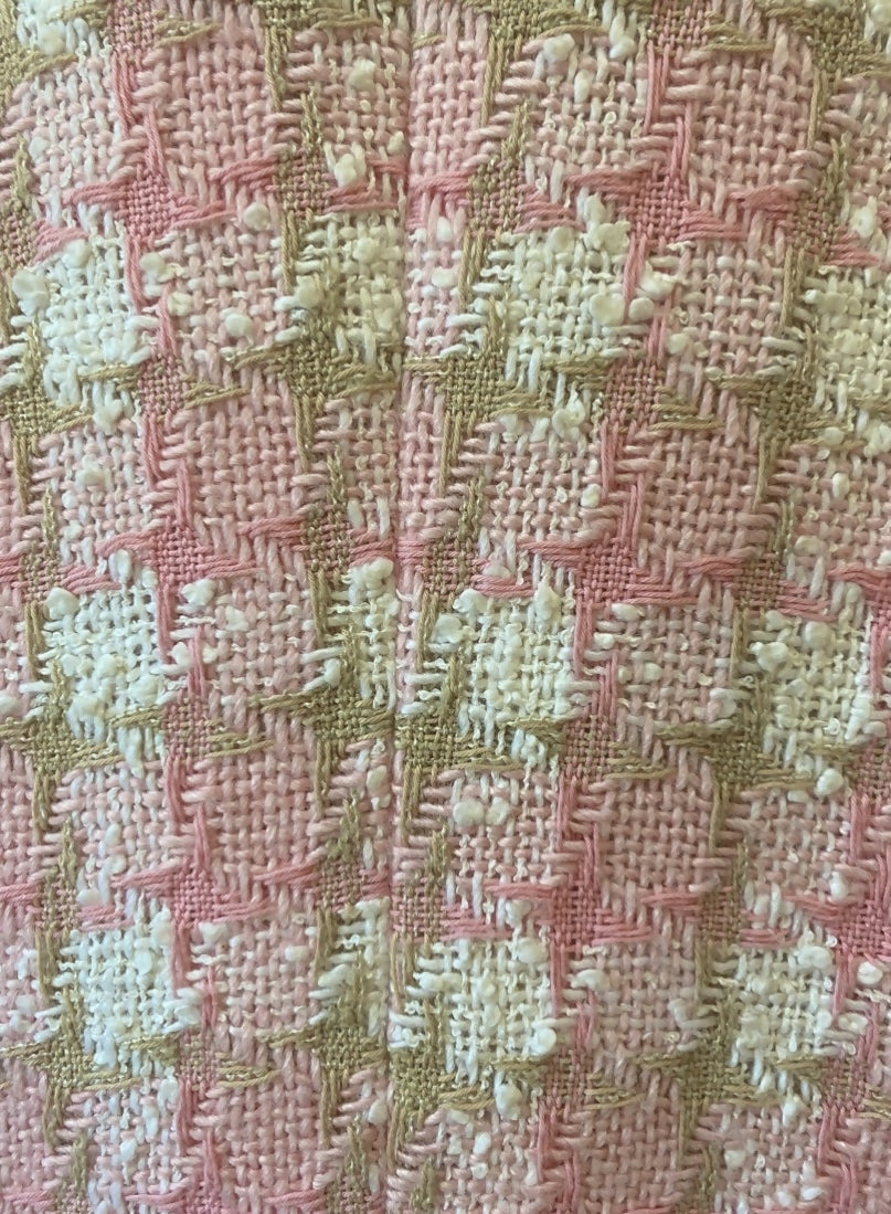 Sublime Chanel tweed fringe checkered pink, white, cream jacket. It has 3 super cute pink and white CC acrylic button closures down the front and one CC button at each sleeve. Double lapel and collar, white tweed overlaying pink. Double cuff’s with fringe ending throughout. White camellia silk signature lining with hem at chain.