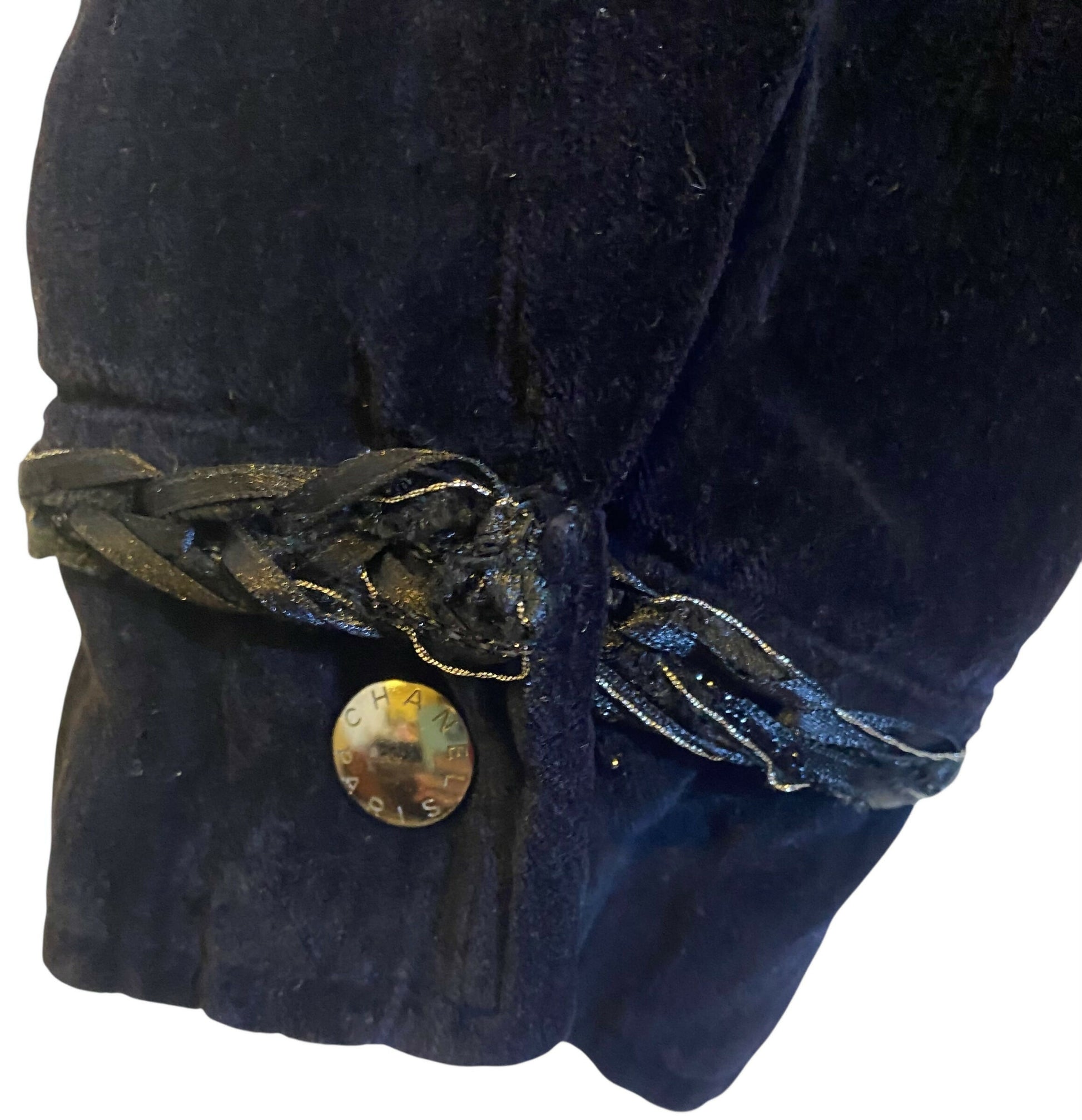 This unique black jacket features a chain and velvet belt, metallic braided trim, silver metallic lurex lining, and 2 size slanted zip pockets with silver CC pulls and Chanel Paris snaps. This stunning jacket is very rare and a must-have for passionate Chanel collectors.