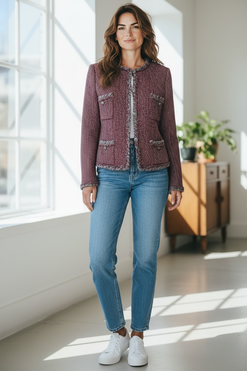 CHANEL 08A BURGUNDY GREY BRAIDED TRIM TWEED JACKET BLAZER FR 38