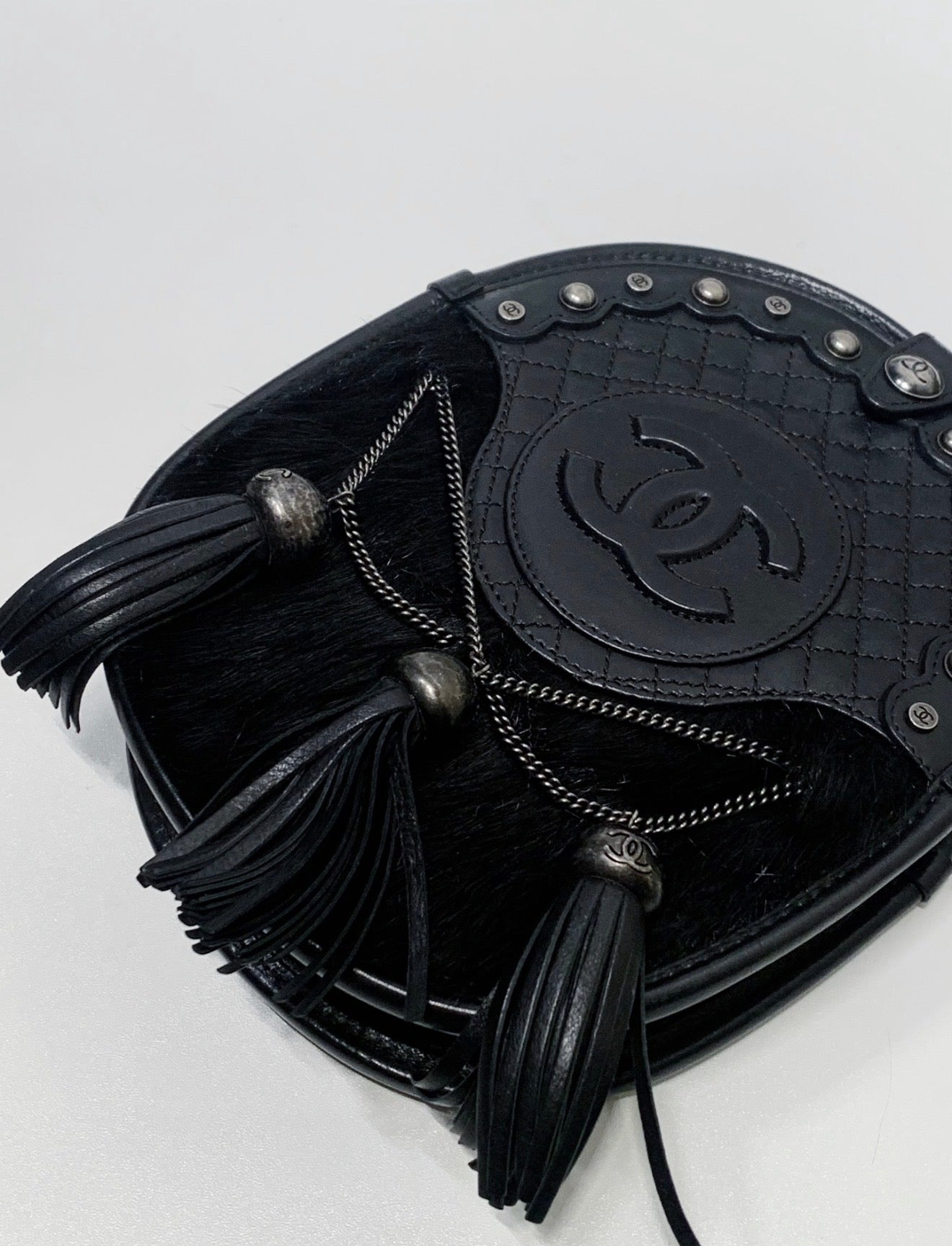 Introducing the rare and unique Chanel 13A Black and Silver Tassel Edinburgh Saddle Chain Bag. This stylish bag features a one-of-a-kind design that is sure to make a statement. The perfect addition to any fashion-forward wardrobe, this bag showcases the perfect blend of edginess and sophistication. Don't miss out on this must-have piece.