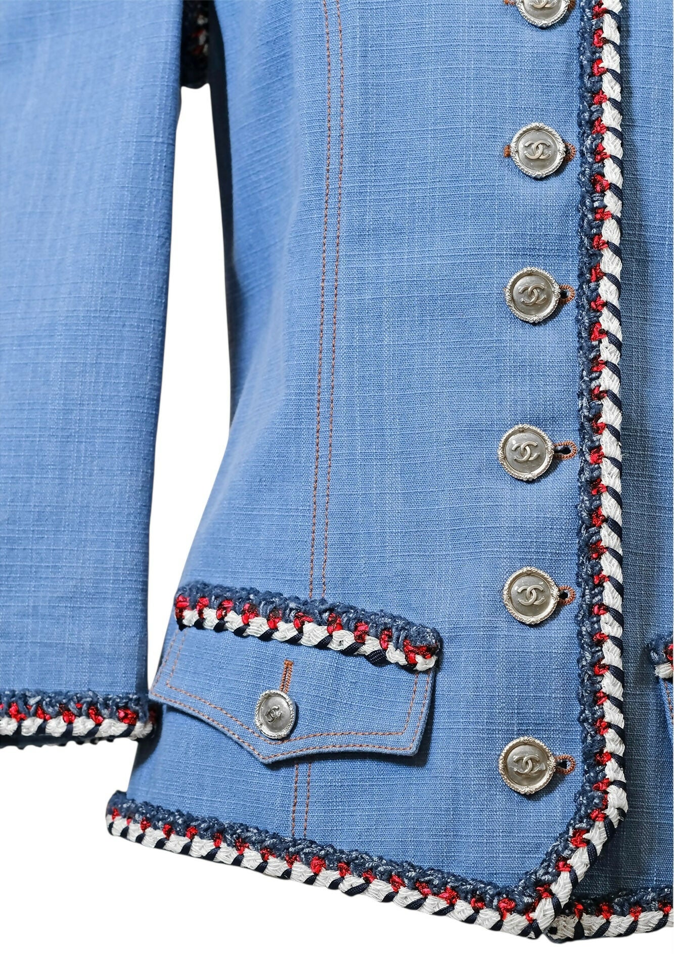 Chanel Light Blue Cotton Jacket that almost looks like jean denim with Red, White, and Blue Silk Braided Ribbon Trim. Lined with Chanel Blue Silk Camellia. Gorgeous CC Buttons 8 down the front, and 2 on each patch pocket. Bracelet length sleeves. Chain at hem.