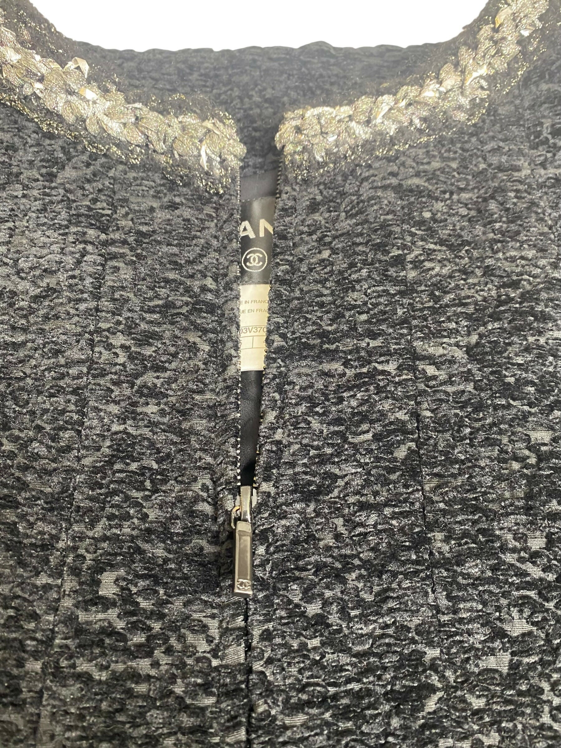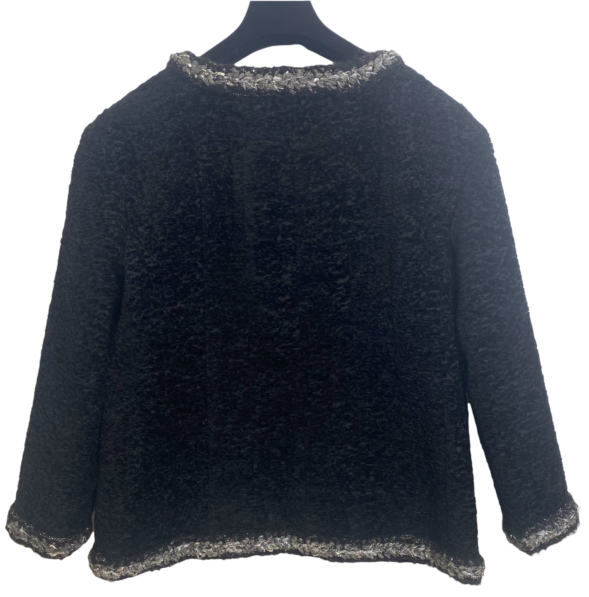 Stunning Luxurious Soft Textured Silk Black Boucle Jacket with Silver Metallic Braided Trim. Features two slit pockets on the front, opens with 2 metal long CC logo dual zippers top and bottom. Fully lined in black camellia silk with signature chain at hem.