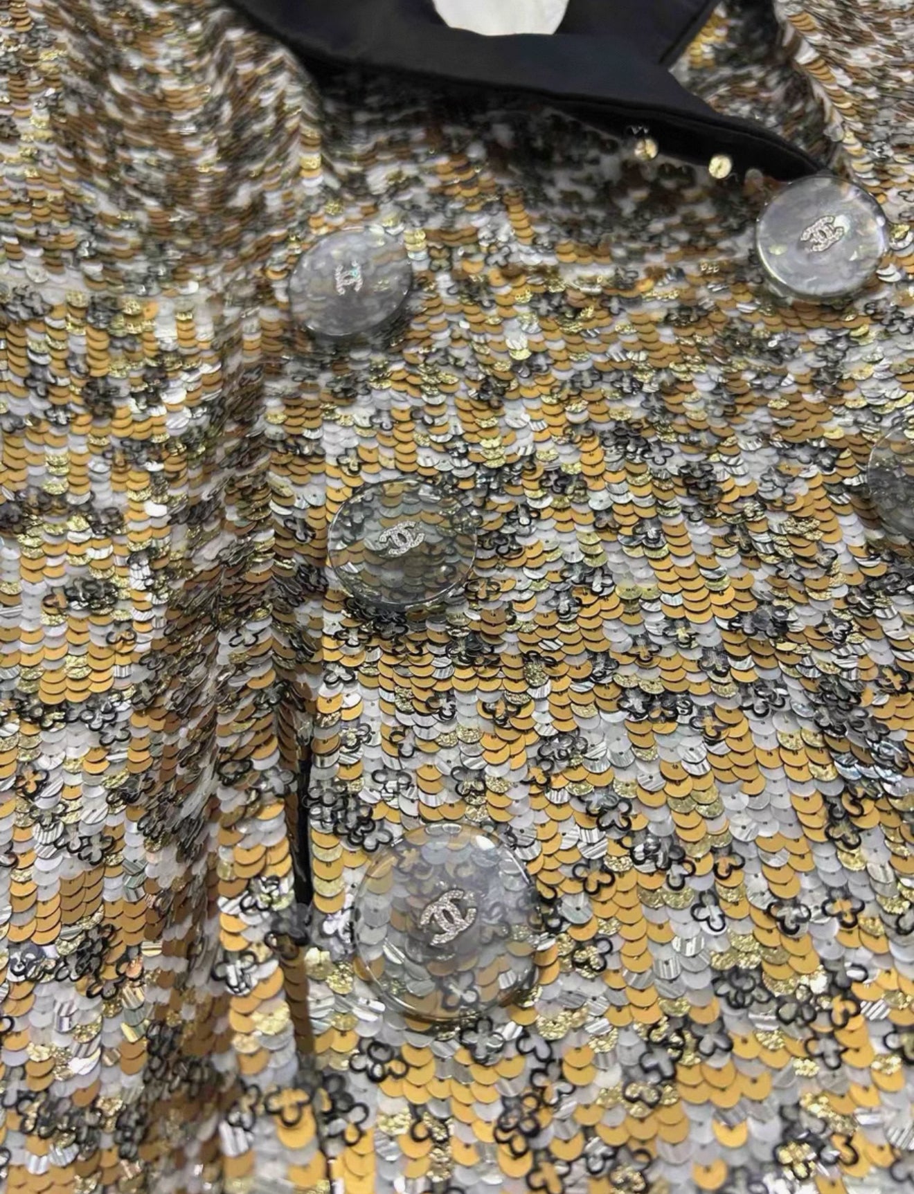 Elevate your wardrobe with this rare Chanel 17A Gold Sequin Jacket. Crafted in size 44, this piece is perfect for adding a touch of luxury to any outfit. The intricate sequin detailing adds a glamorous touch while the golden hue exudes elegance. A must-have for any fashion-forward individual.