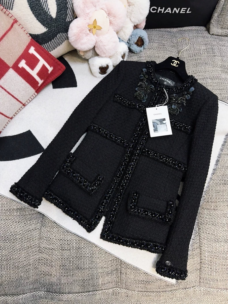 This Chanel 17A black tweed jacket from the Metropolitan Collection is a rare and striking piece. Embroidered with flowers and pearls, it exudes sophistication and elegance. This size 34 jacket is new and offers exquisite craftsmanship and style. Perfect for any fashion-forward individual, this jacket is a must-have addition to your wardrobe.