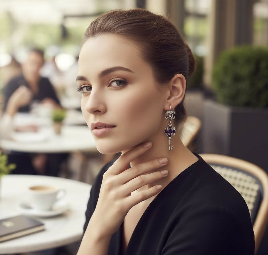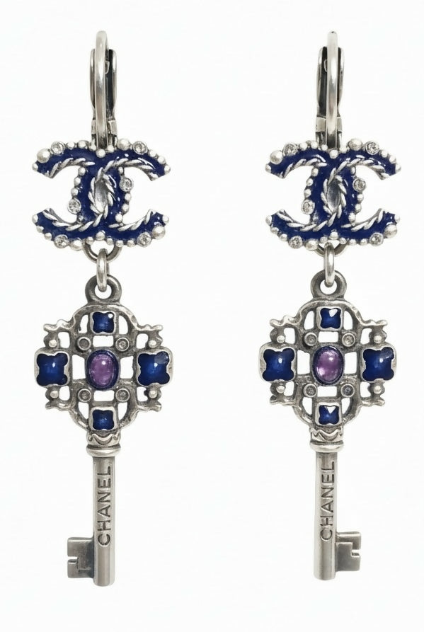 These pierced drop earrings from Chanel have the power of adding ultra-glam looks to your ensembles. They come crafted from silver gunmetal and styled with the iconic CC logo motifs and engraved CHANEL keys that are embellished with Purple Navy Blue enamel. Super Cute and Unique!