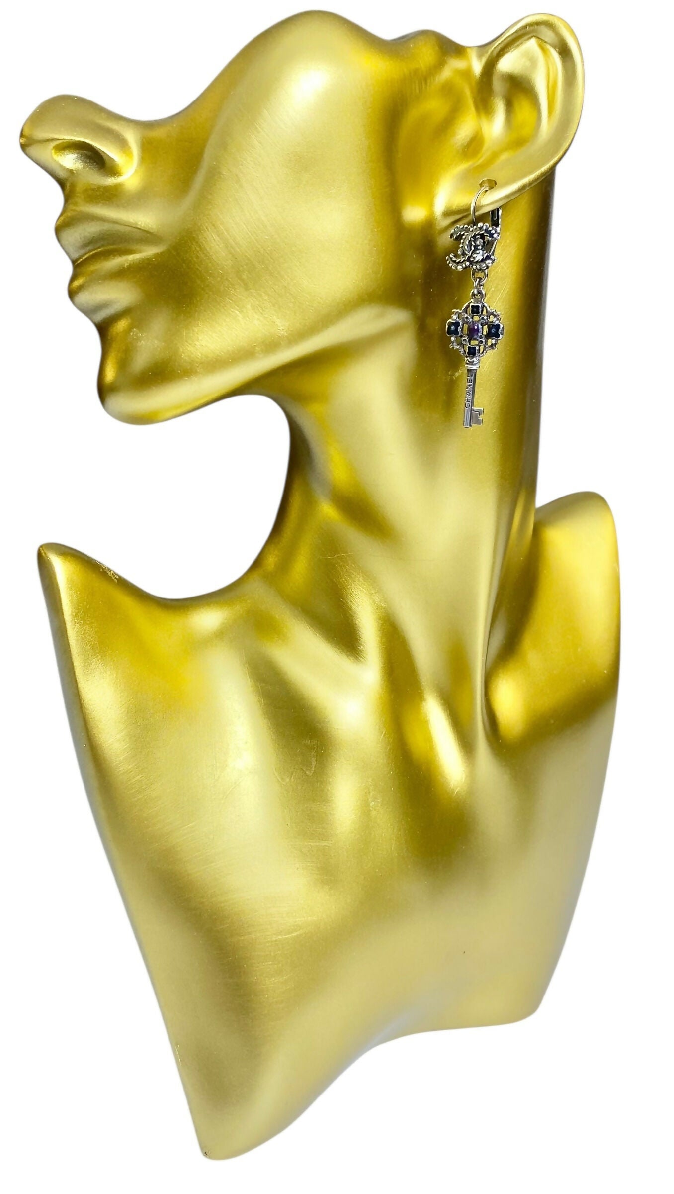 Chanel 17A Ritz Cosmopolite CC Key Dangle Drop Silver Pierced Earrings