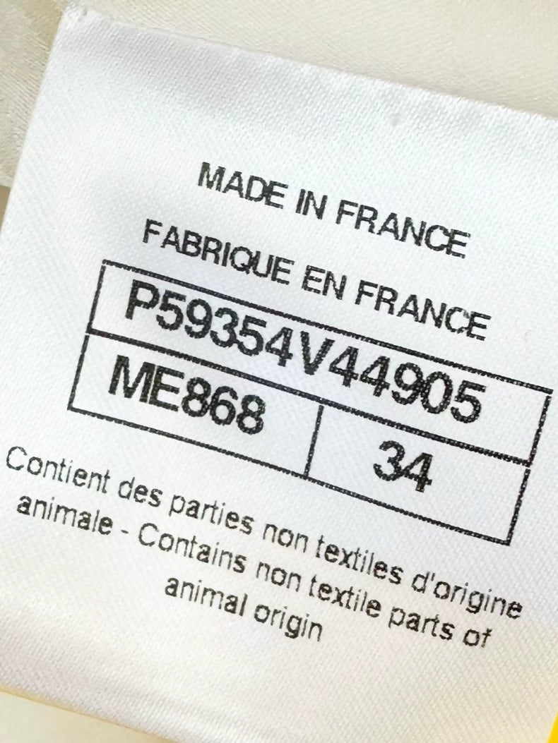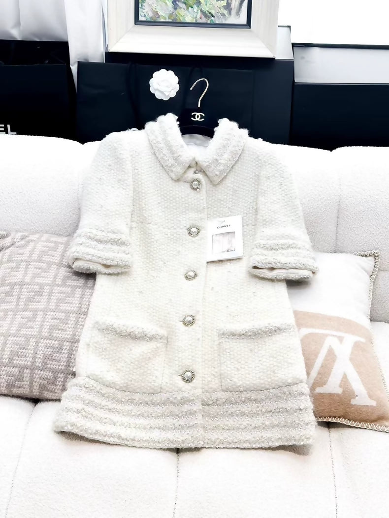 Chanel 18A ecru tweed dress from the Métiers d'Art Hamburg Collection in size 34, unworn with original labels and documentation. This exceptional piece blends structure and artistry in thick off-white wool, adorned with hand-applied pearls and sequins that catch light with every movement. Mid-length sleeves and a striking oversized pearl flower button define the silhouette, while the included spare clasp pouch speaks to Chanel's meticulous attention to detail. A museum-quality investment for the serious collector.