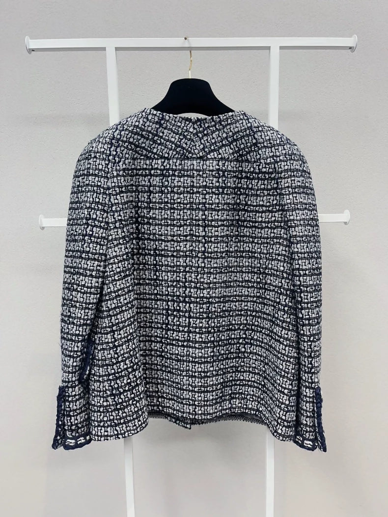 This Chanel 19 jacket, in a beautiful blue gray tweed, is available in size 34. Expertly crafted and designed, this jacket is a timeless addition to any wardrobe. Perfect for any occasion, it offers sophistication and elegance with a touch of luxury.