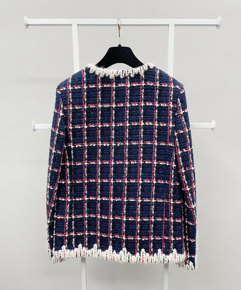 The Chanel 19 tweed jacket from the snow series features a classic British college style with red, blue, and white plaid and white piping design. Its new with tag condition and size FR34 make it a unique and highly recognizable piece. Elevate your wardrobe with this iconic and stylish jacket.