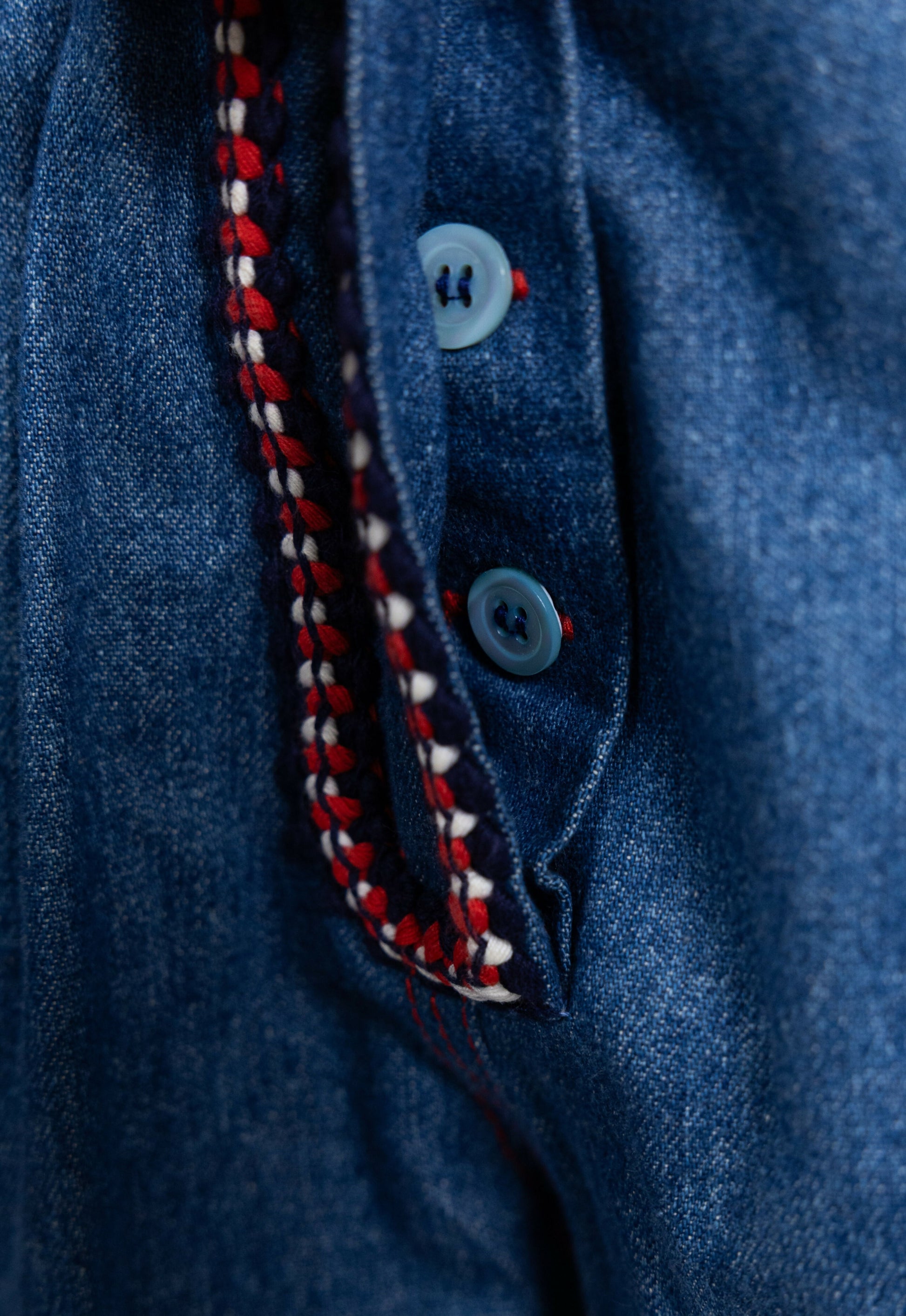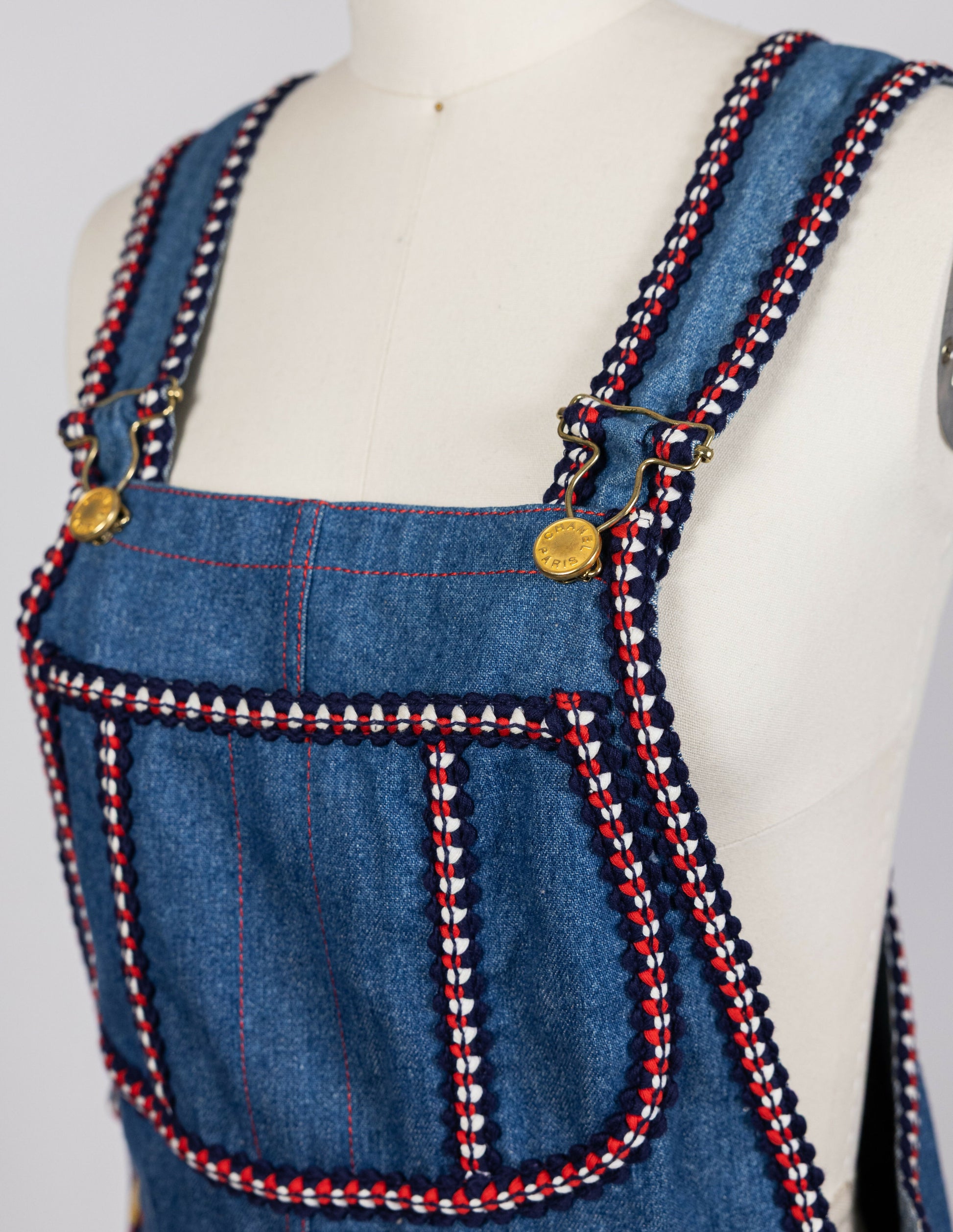A playful piece from the 1990s, these vintage Chanel denim overalls are trimmed with bold red and white piping that highlights the silhouette’s structured lines. Gold-tone button accents and contrast stitching elevate the utilitarian shape, while the oversized front pocket and flared leg capture the era’s carefree energy. A rare and spirited example of Karl Lagerfeld’s ability to blend youthful charm with unmistakable Chanel codes.