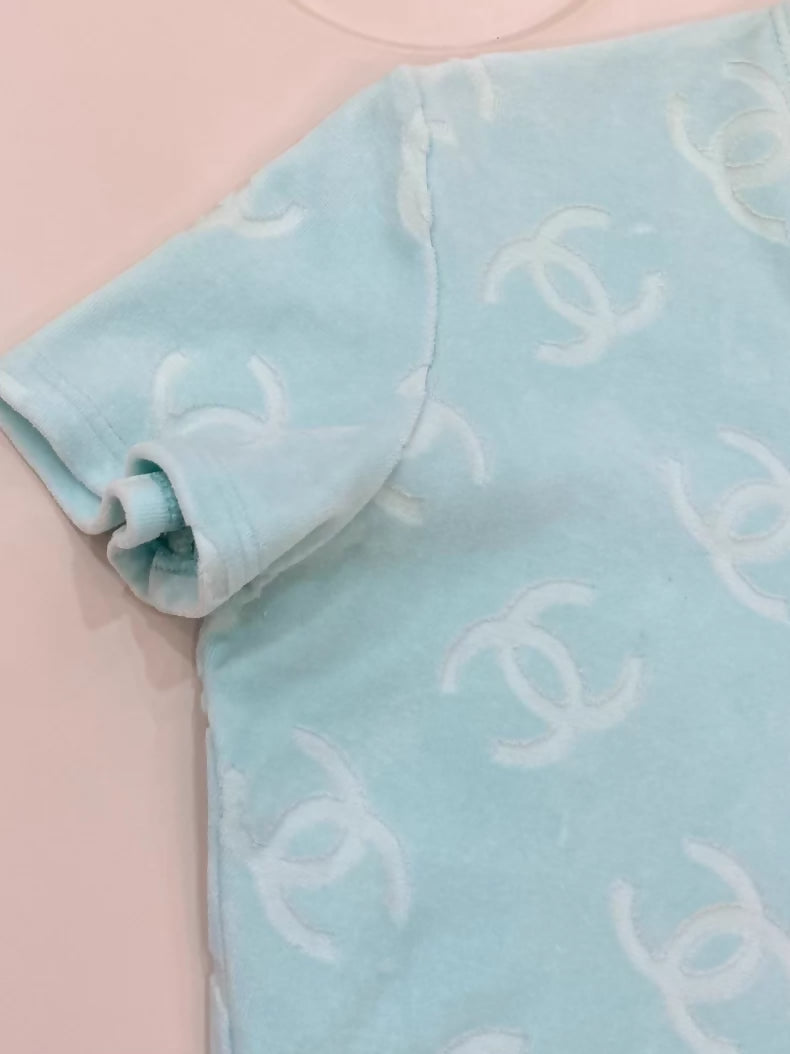 Chanel 1996 velvet all-logo top in an ethereal baby blue—a coveted archival piece from a season when the house embraced tonal logo jacquard with exceptional restraint. Crafted in sumptuous velvet, the fabric carries a whisper-soft hand and luminous finish that deepens the delicate blue throughout. Sized F44 but cut close to the body, fitting closer to F36/F38. The all-over logo motif reflects 1990s Chanel's confident minimalism, neither loud nor understated. Vintage market demand for this particular season remains exceptionally high, with authenticated examples rarely surfacing. A significant find for collectors seeking pre-2000 Chanel knitwear with documented provenance and wearable condition.