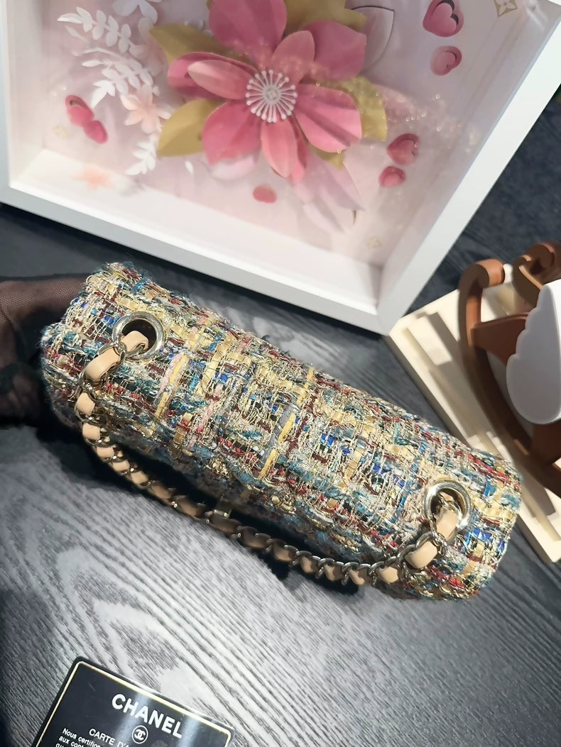 Chanel's iconic CF mini chain bag from the coveted 19A Egypt Collection, crafted in luxurious woven tweed with mixed gold-tone hardware. This timeless piece showcases the house's signature quilted design and elegant chain strap, perfect for elevating any ensemble. Pristine condition. A collector's essential from a sought-after seasonal release.