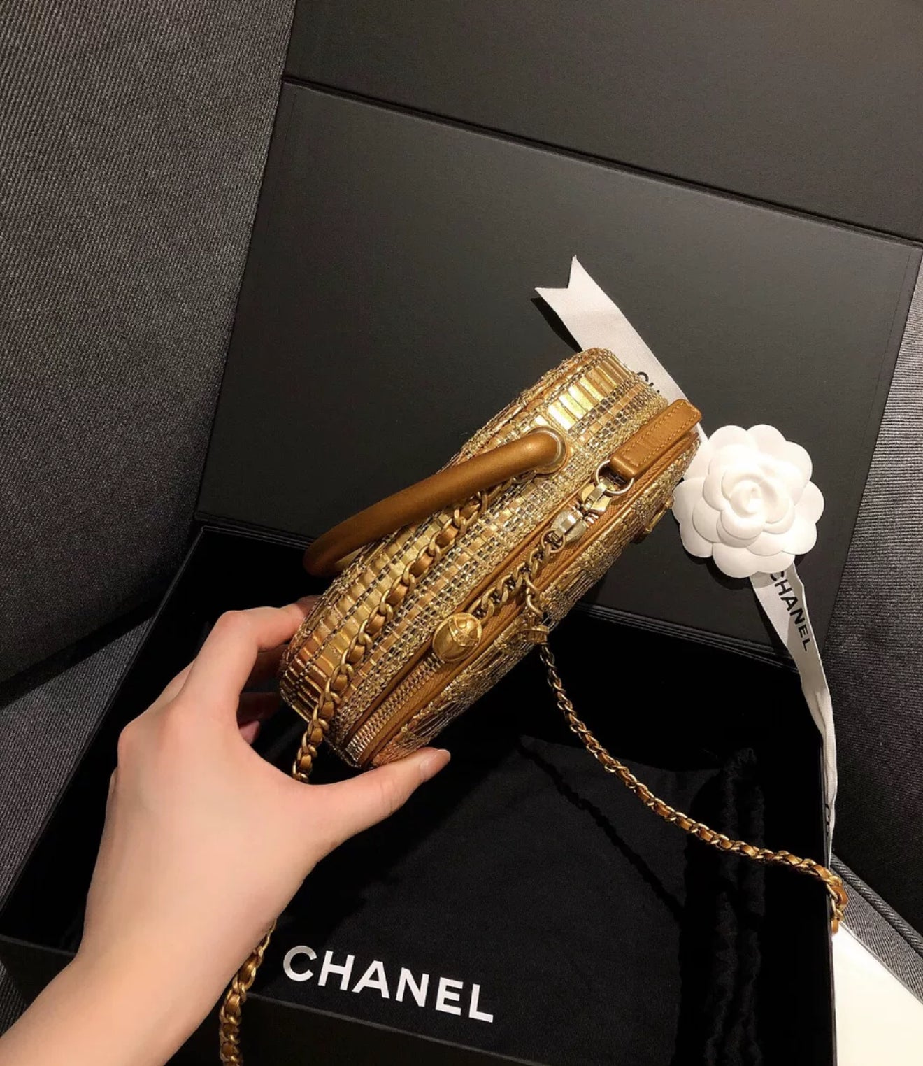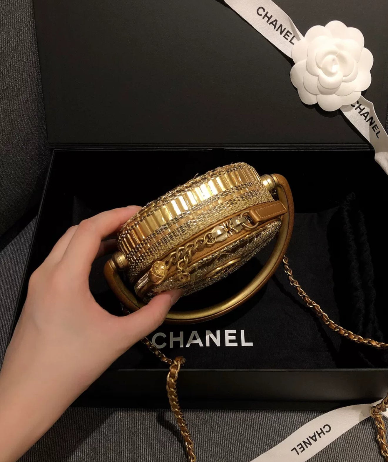 Chanel 19A Egyptian Gold Tweed Runway Handle Crossbody Bag