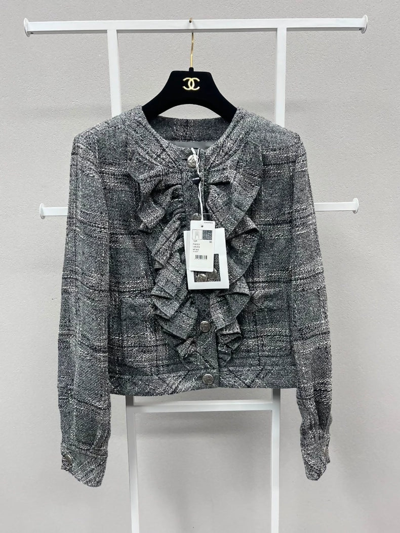 This Chanel 19p tweed jacket combines classic French design with modern ruffled detailing for a sophisticated and stylish look. With the new tag still attached, this jacket is a fresh addition to any wardrobe. Made with high quality tweed, this jacket is sure to provide both comfort and elegance. Size 36