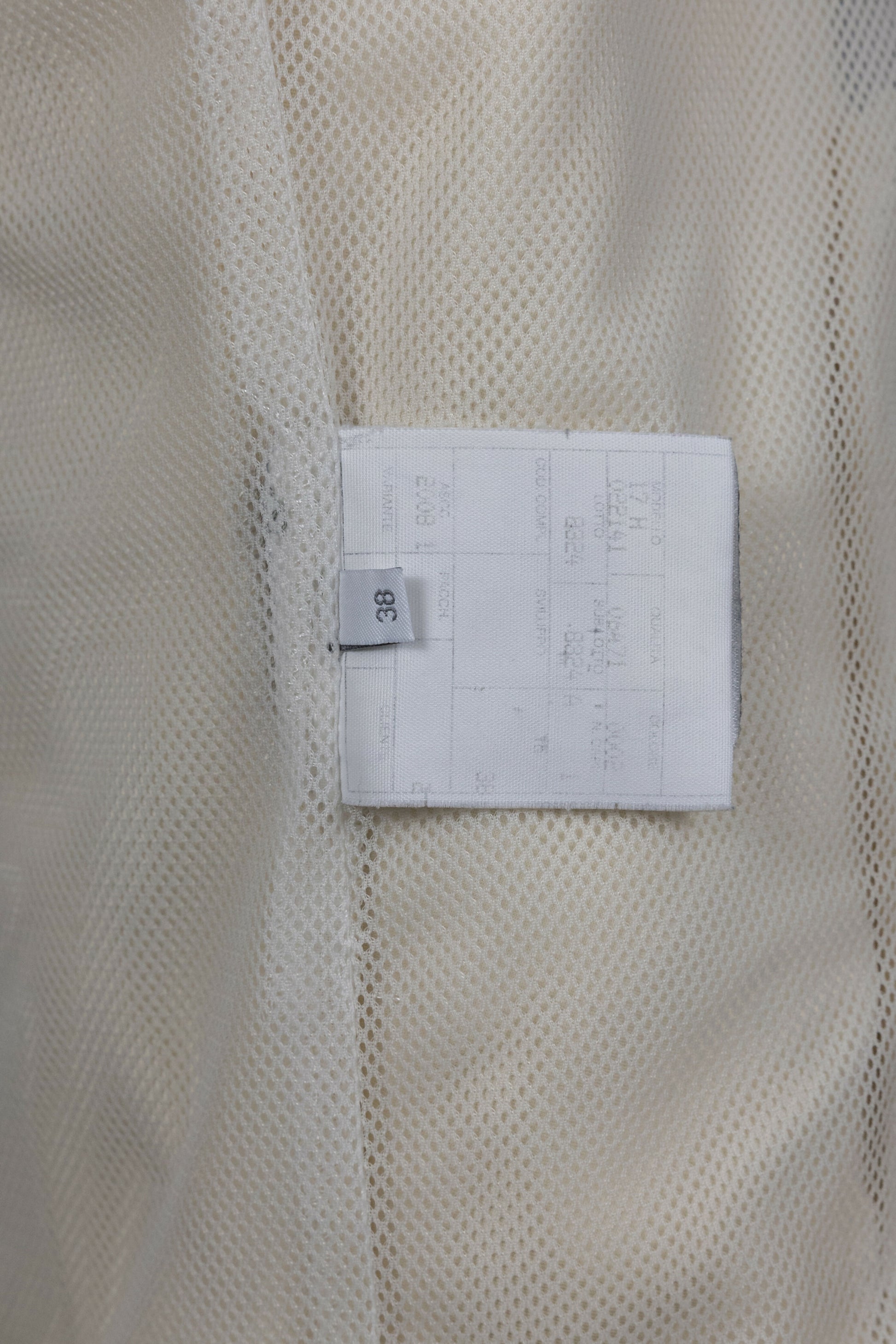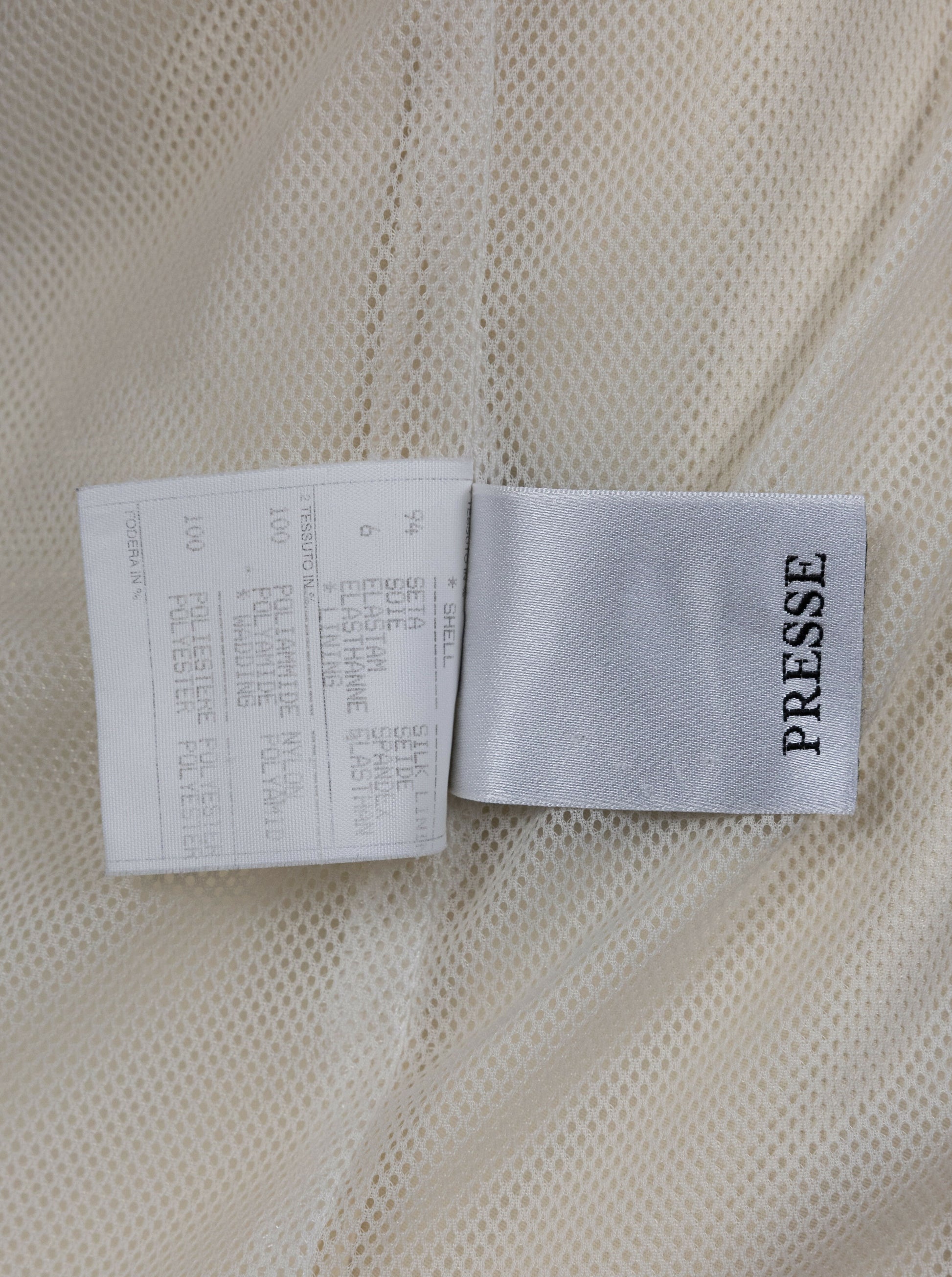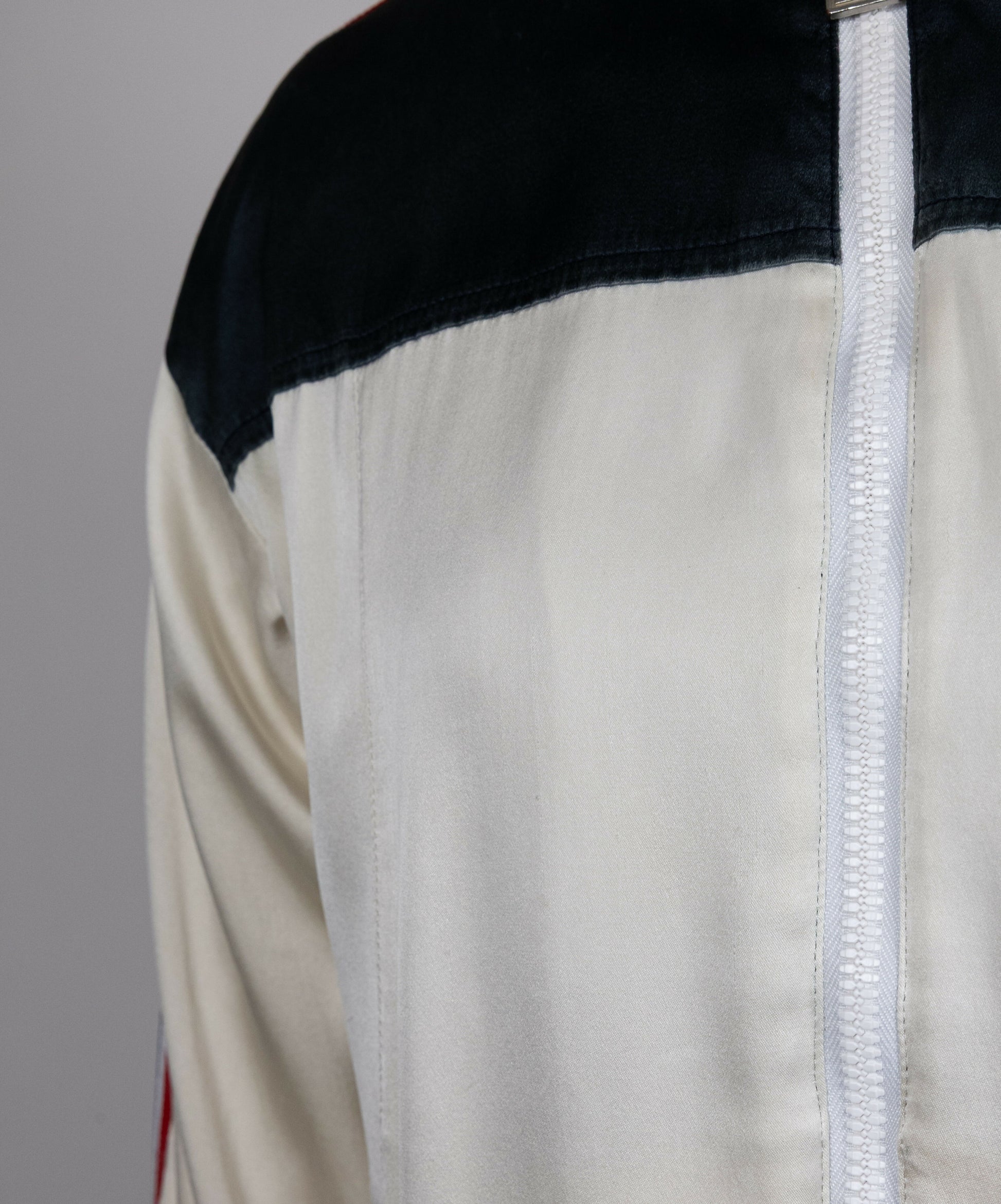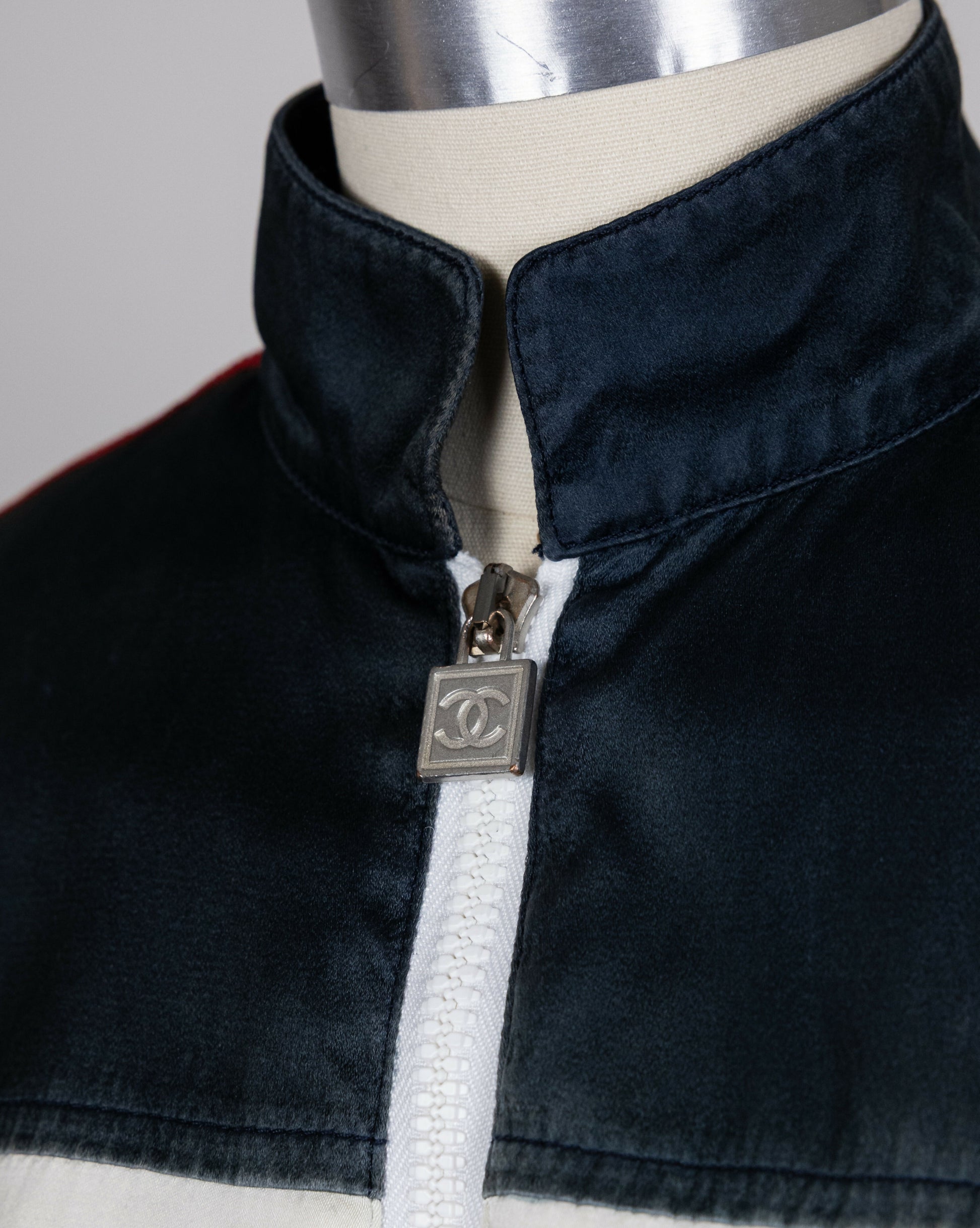 This vintage Chanel jacket from the Spring 2002 collection showcases the brand’s signature sporty-luxury aesthetic from the early 2000s. Crafted from cream-colored silk, the jacket features bold navy blue, red, and white stripes running down the sleeves, adding a dynamic contrast.