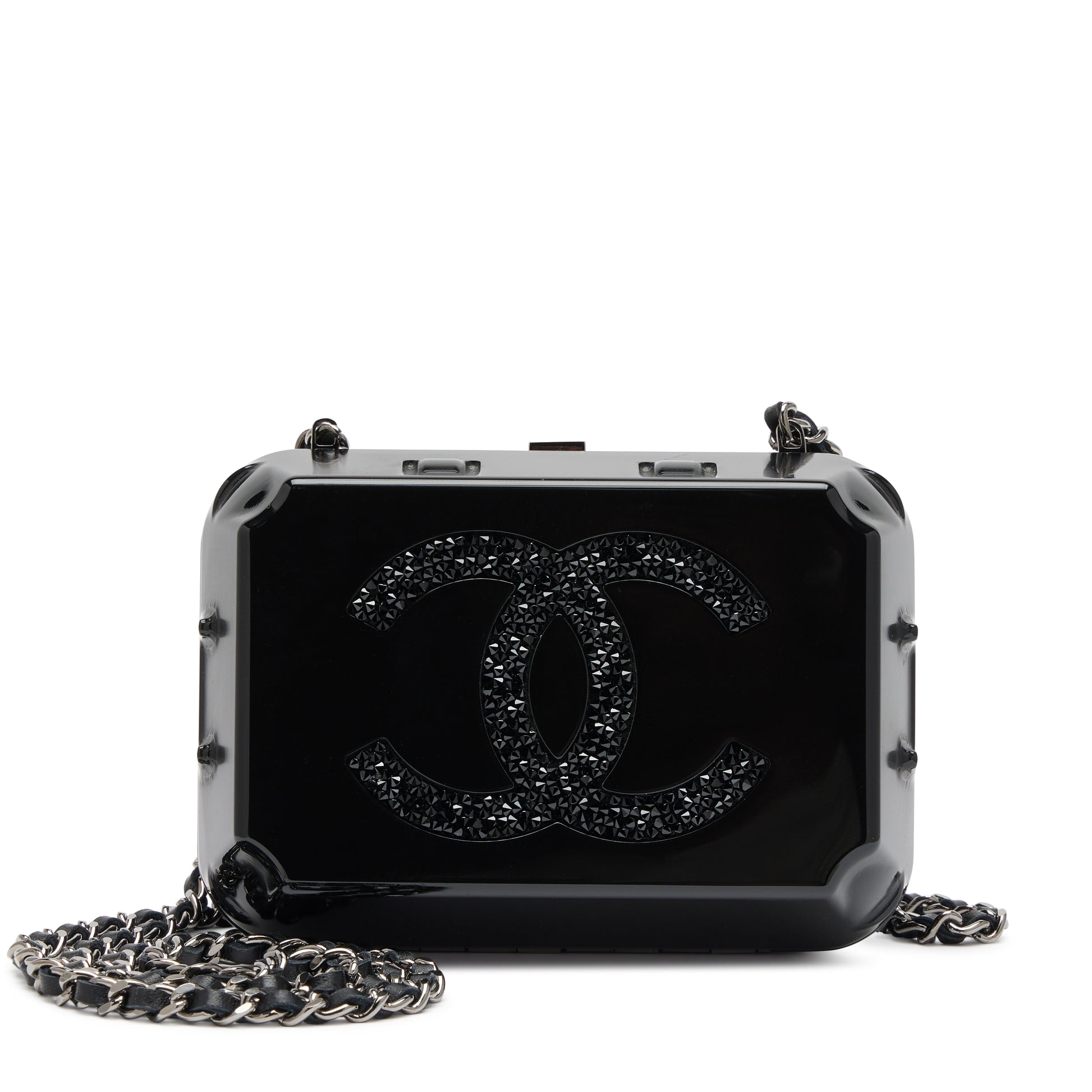 Chanel 2014 Black Plexiglass Supermarket Egg Carton Minaudière Strass CC Jewelry Box Clutch Silver Hardware