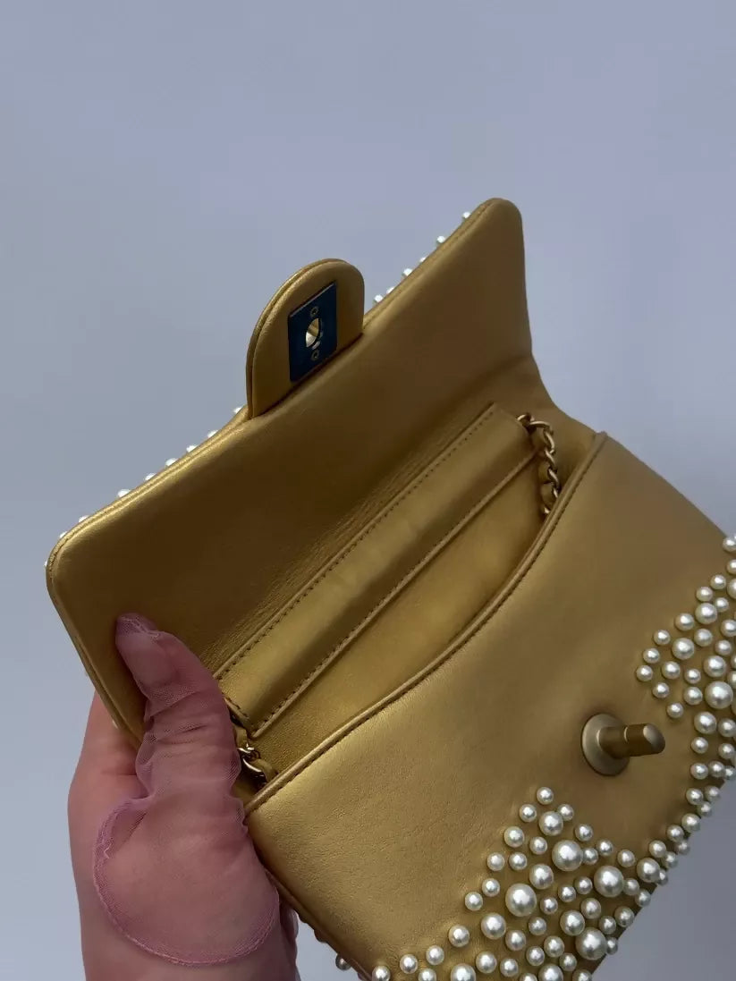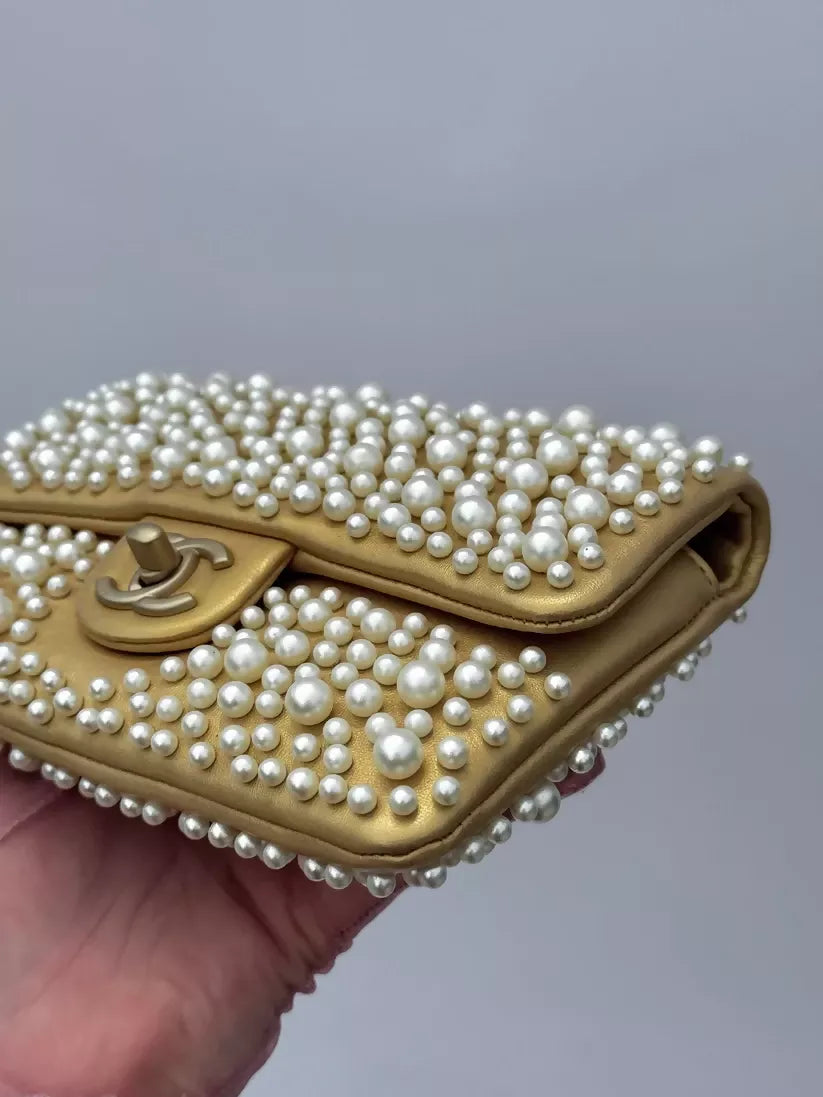 An exceptional collector’s piece from Chanel’s celebrated Paris–Dubai Métiers d’Art collection. Crafted from luminous gold metallic leather, this rare Wallet on Chain is meticulously embellished with cascading clusters of hand-applied white pearls in varying sizes — a signature detail evoking the opulence of both desert and sea.
