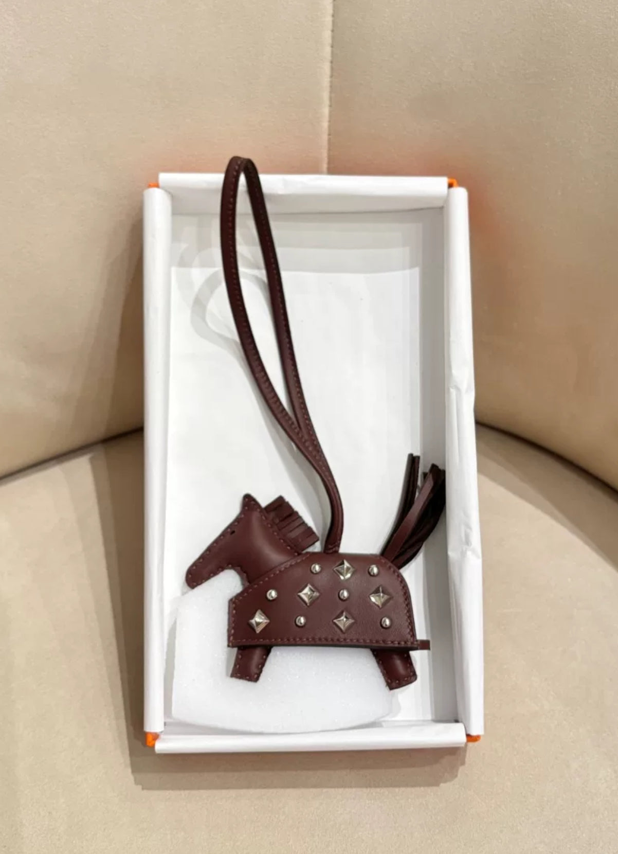 Introducing the Hermès Rodéo Terre Rock PM Charm. Crafted from luxurious lambskin, this brand new horse charm boasts metallic studs and a blanket detail. The perfect accessory for any horse lover, it also comes with a lanyard for easy attachment. Elevate your style with this elegant and timeless piece.