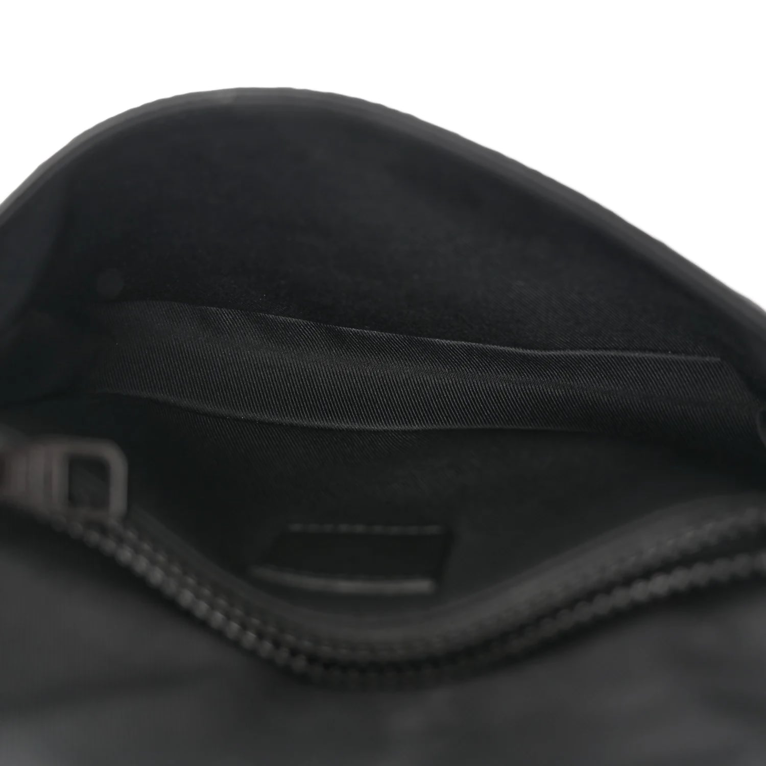 This unisex chic bag features Louis Vuitton monogram leather in matte black. The bag features an adjustable black canvas shoulder strap, a rear flat pocket, and a front flap with a matte black magnetic closure. The front flap opens to a black fabric interior with a zipper compartment that also acts as a patch pocket. This can be worn on the waist or across the body adjustable size.