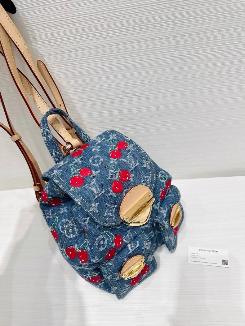 # Louis Vuitton/Takashi Murakami collaboration cherry backpack A rare intersection of haute couture and contemporary art, this limited-edition backpack merges Louis Vuitton's iconic craftsmanship with Takashi Murakami's playful aesthetic. The denim construction features intricate cherry embroidery, creating a distinctive visual narrative that transcends typical luxury accessories. A singular piece from a celebrated collaboration, this backpack represents a moment in fashion history—designed for the discerning collector who values artistic vision and exclusivity over everyday utility.