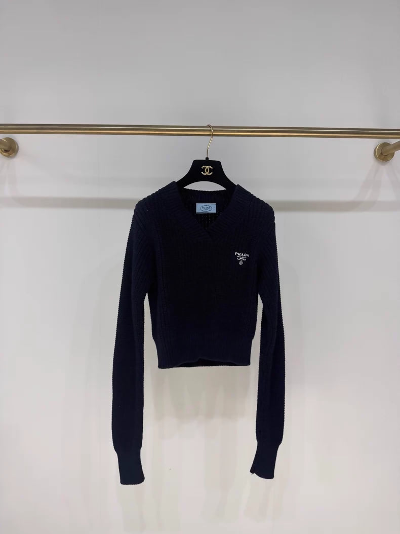 Prada navy blue V-neck knit sweater with triangle logo