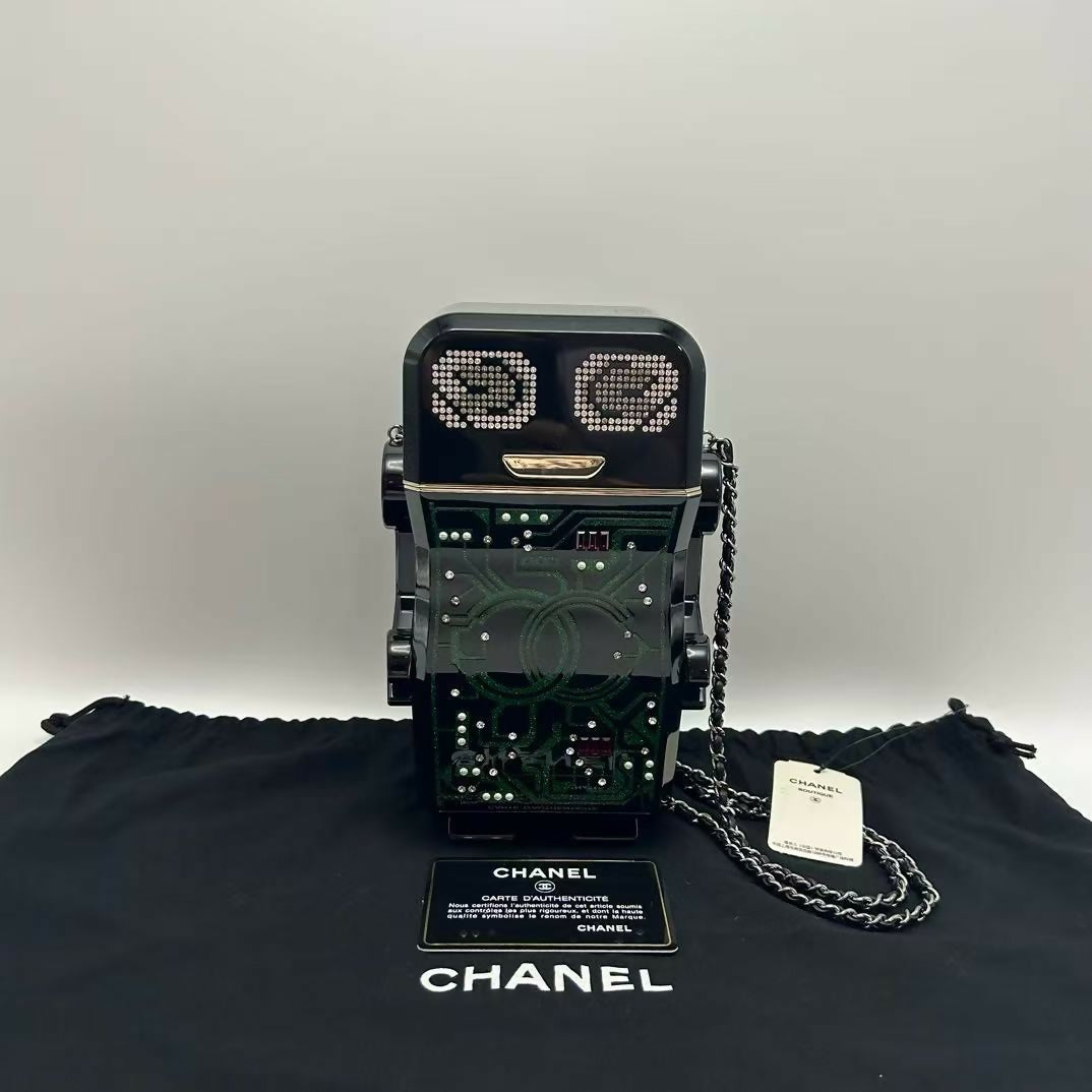 pre-owned chanel limited edition robot minaudière bag black plexiglass and crystals ruthenium hardware