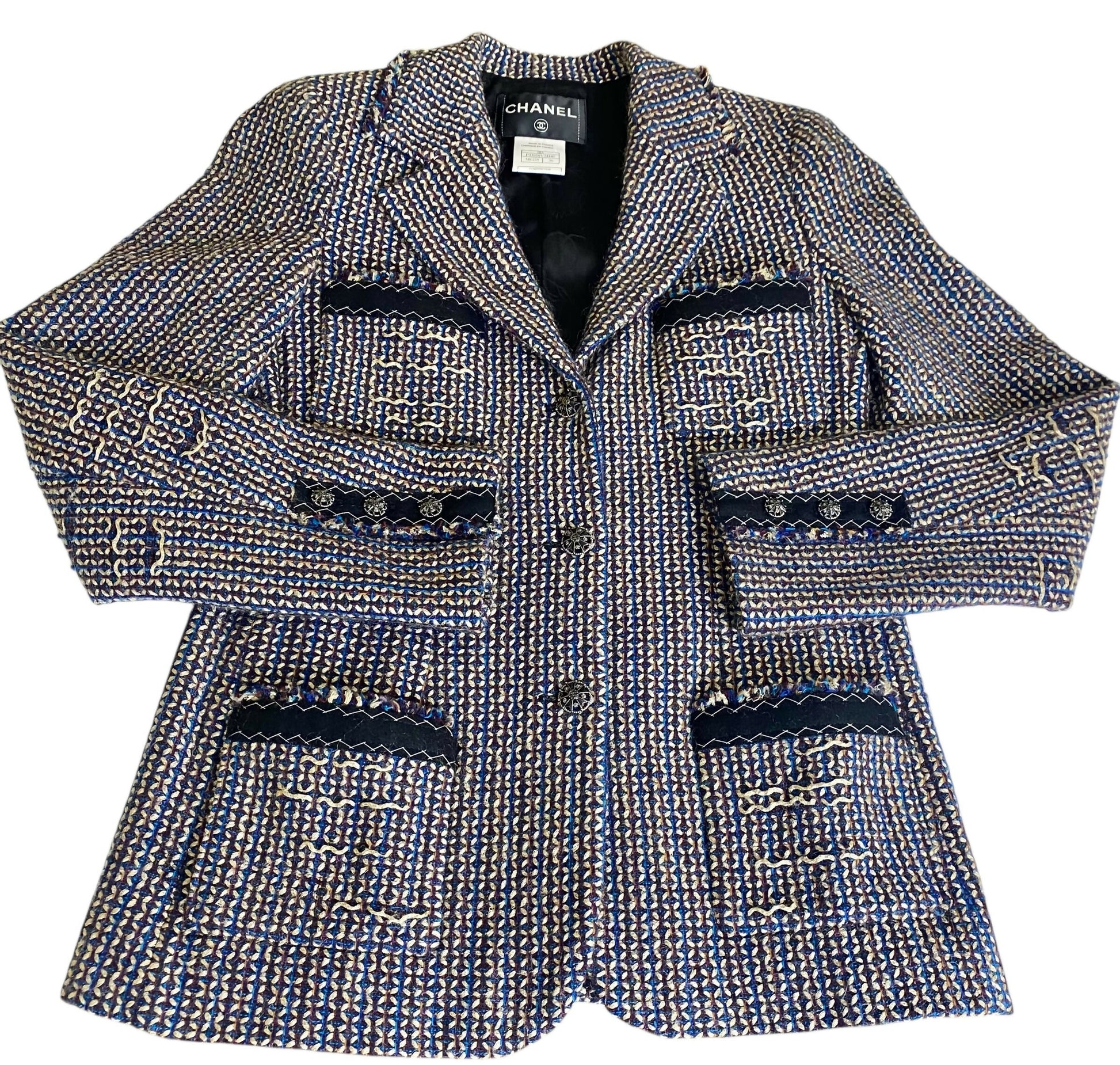 Rare Chanel Button Down Blazer Jacket in Beautiful Fall Warm Shades of Turquoise Blue, Brown, Purple, Taupe, Gold, and Black. Fringe Tweed Edges with 3 Ornate CC Cross Metal Buttons Down the Front as Closure, and 3 at each sleeve. There are 4 patch pockets with black trim and stitched detailing, also at the sleeves. Fully lined in Black Camellia Silk.