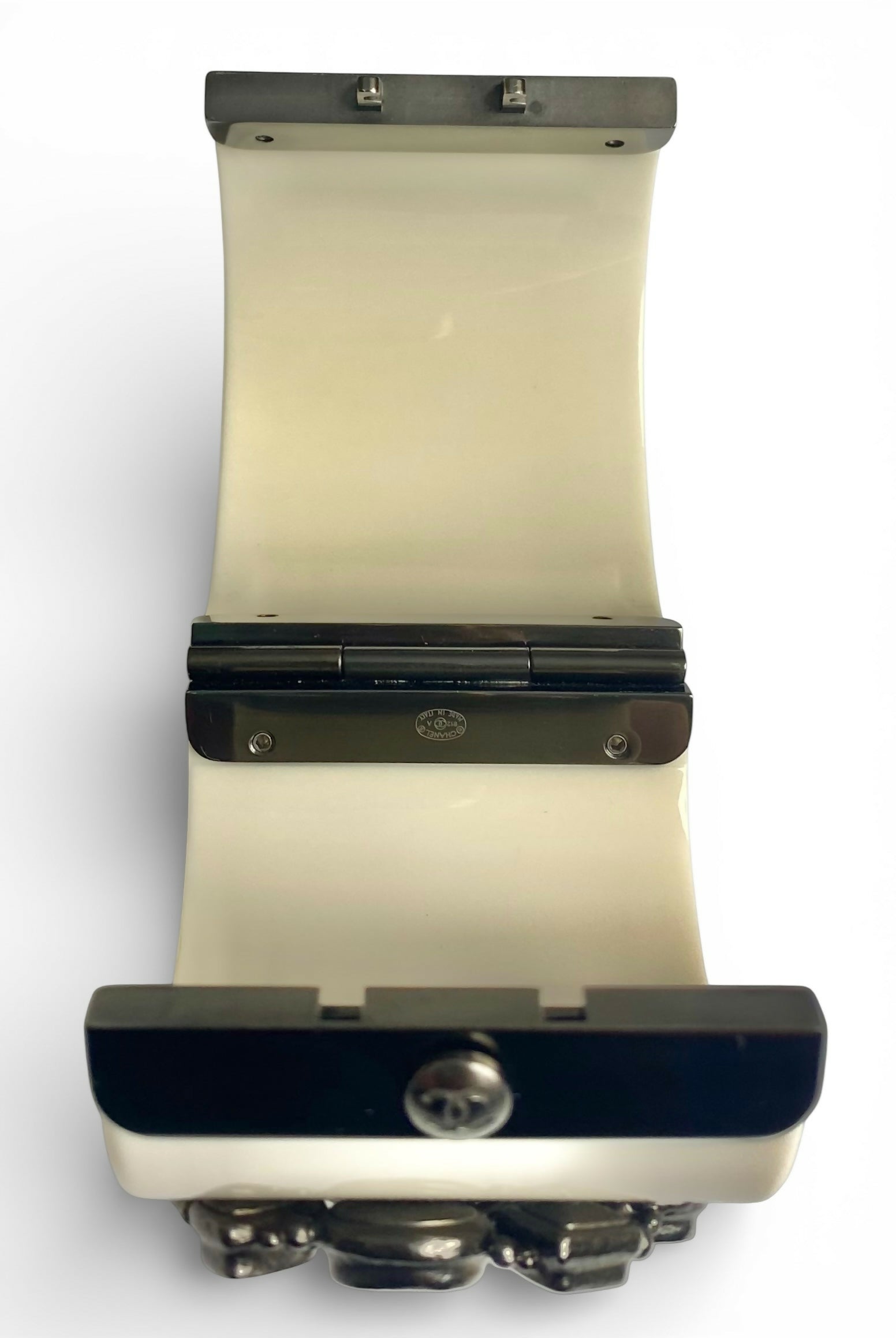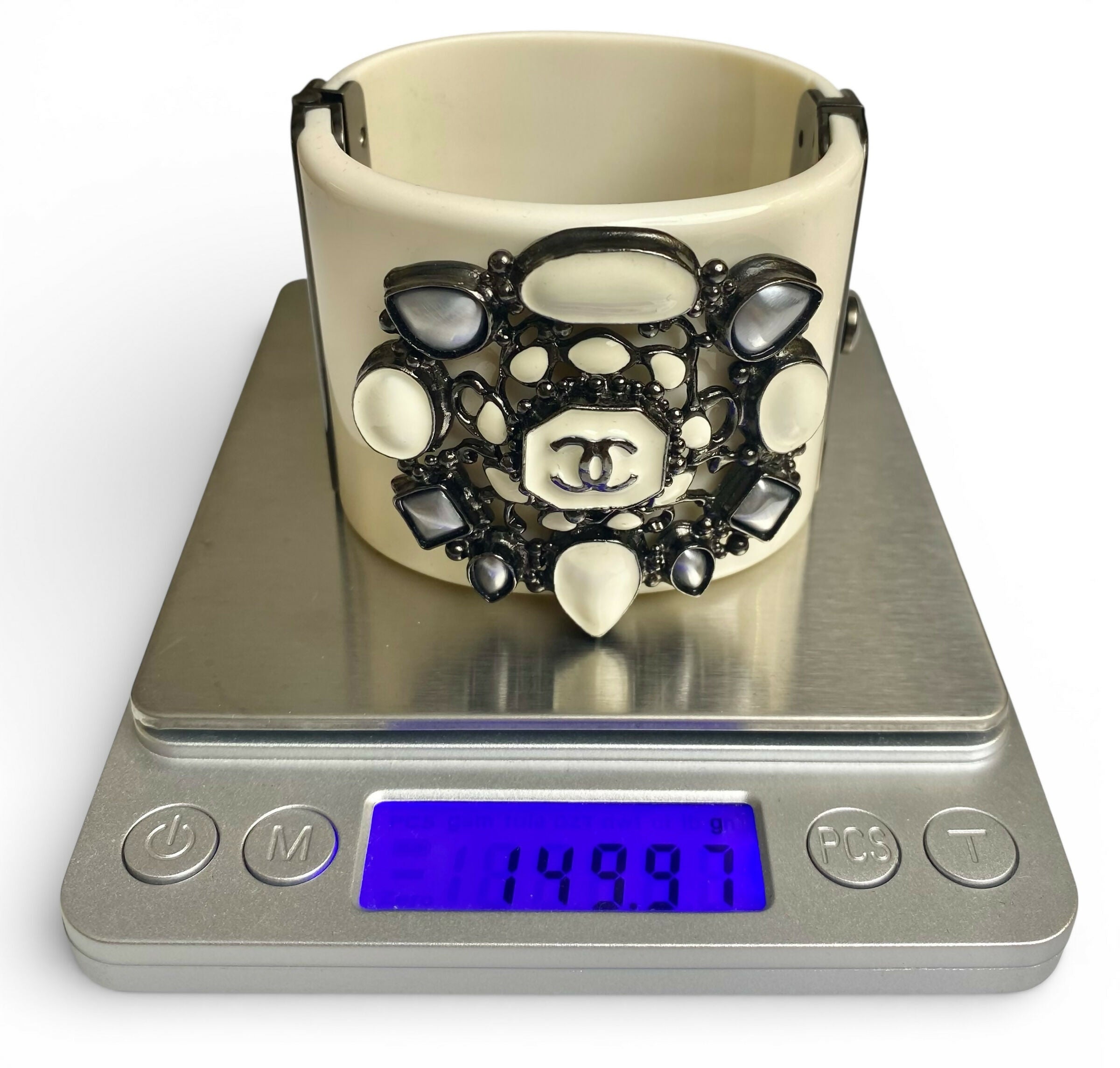 A statement Chanel Cuff by the House's iconic Baroque aesthetic, crafted in ivory resin and elevated by sculptural cabochon stones set in darkened silver-tone hardware. Bold yet timeless, it reflects Chanel's signature balance between elegance and strength.
