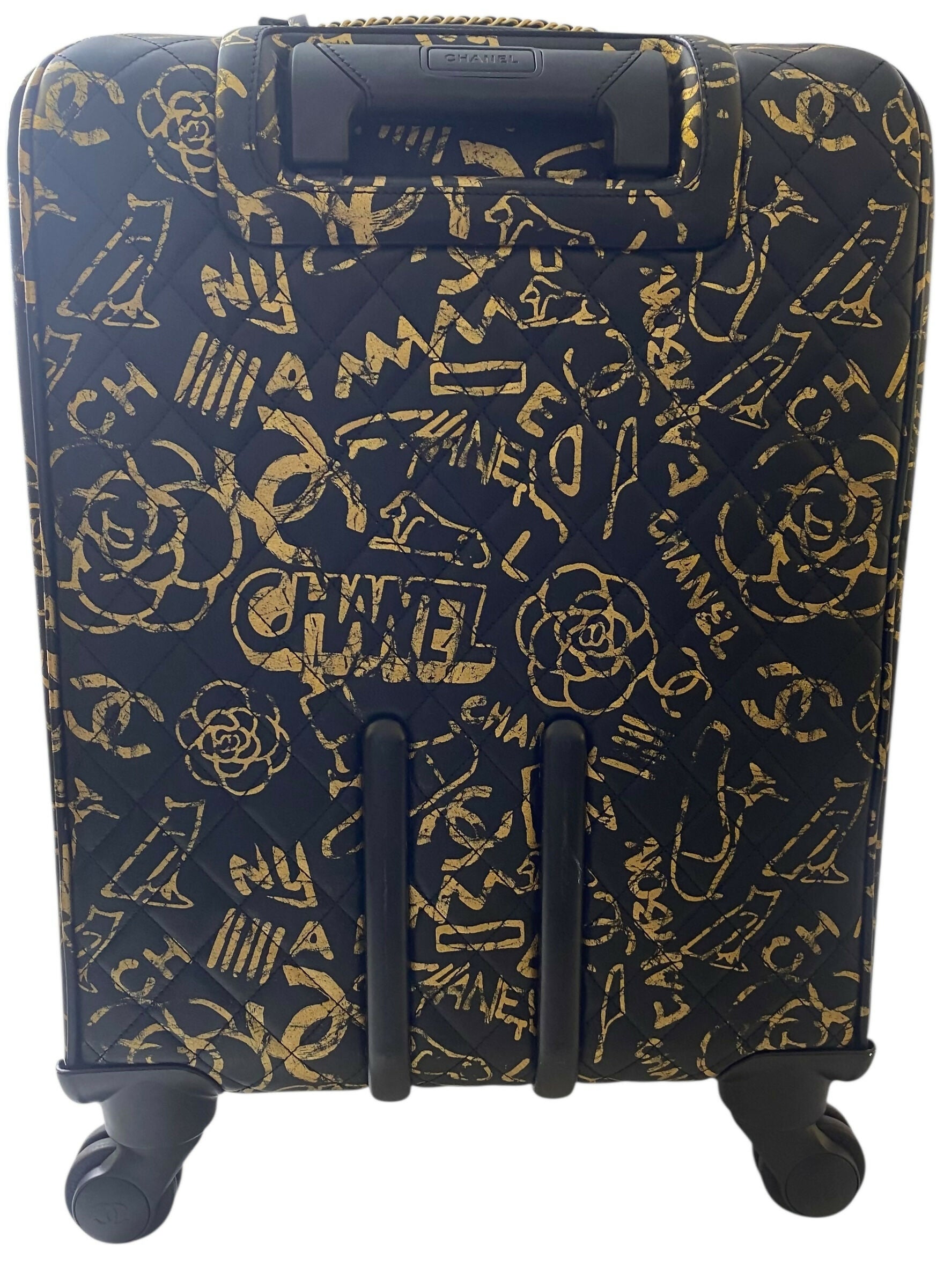 Chanel Minaudière in Black and gold graffiti print calfskin Chanel Paris-New York Egypt Trolley with gold-tone hardware engraved with Chanel, dual top handle with chain-link accent one at side, single retractable handle, single exterior slit pocket, four multi-directional wheels, tonal nylon lining, 3 interior zip pocket, single compression strap with Metal Interlocking CC and zip around closure. Black 360 degree turning wheels with Chanel embossed. A practical layout with three inner attached garment pockets and one outer pocket.