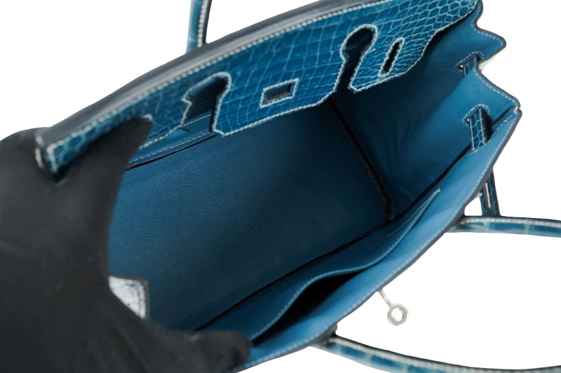rare Hermes Birkin 30 blue denim crocodile leather palladium hardware