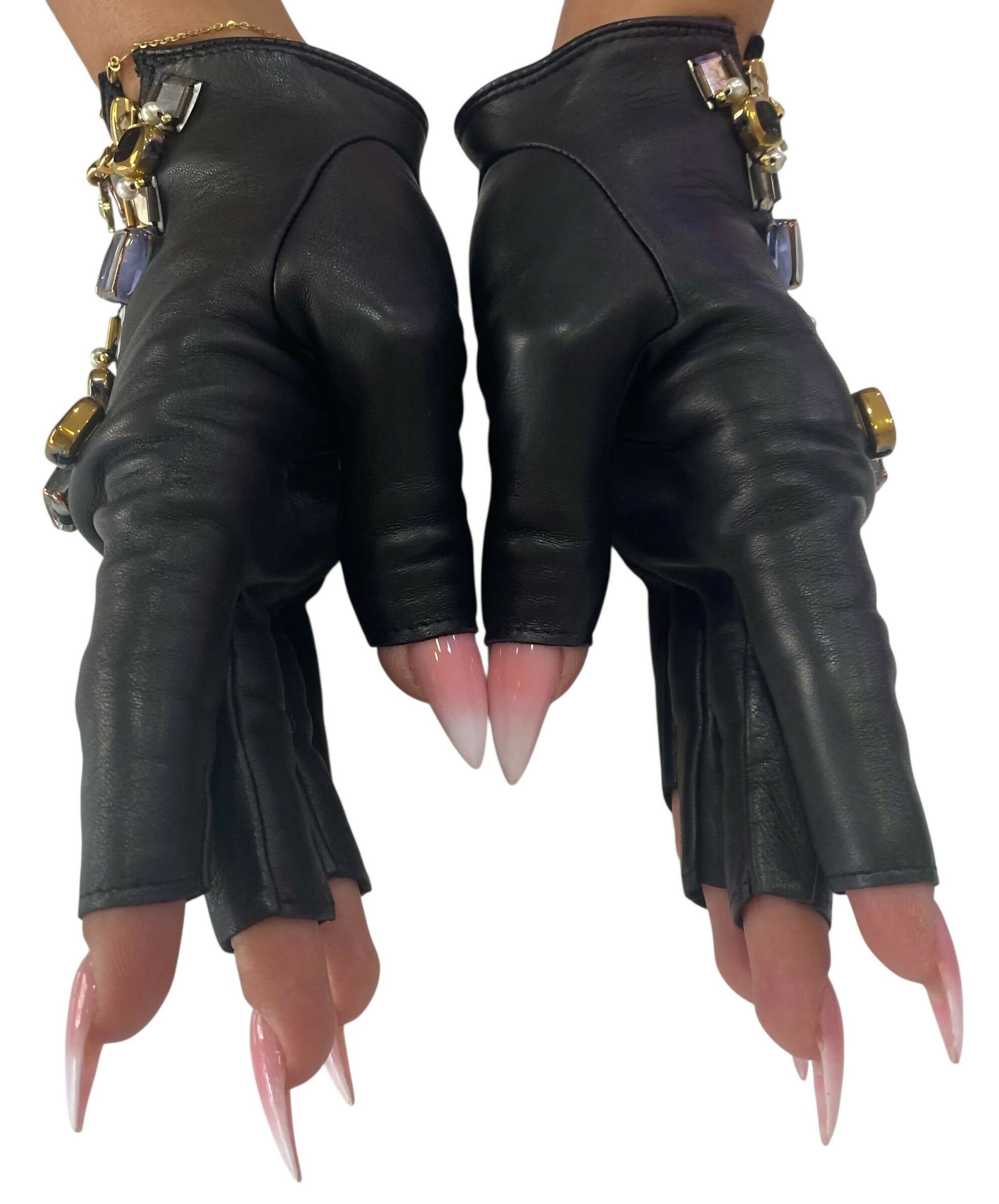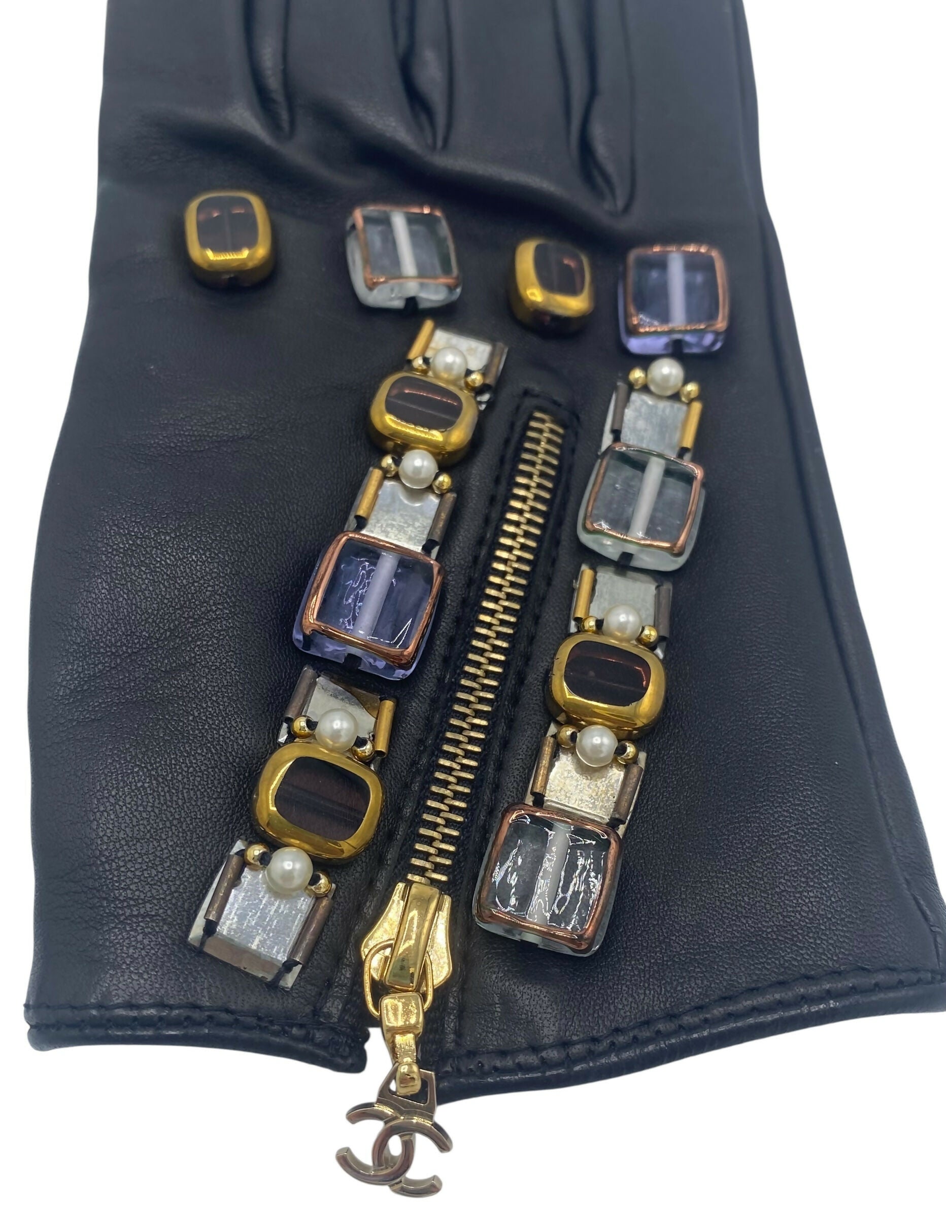 These Show Stopping Black Lambskin Gloves have embellished Multicolored Stones accented in gold metal, Antique Appliqués with Tiny Pearls Beads. Unique Gold asymmetrical Zippers with CC pulls at each end.