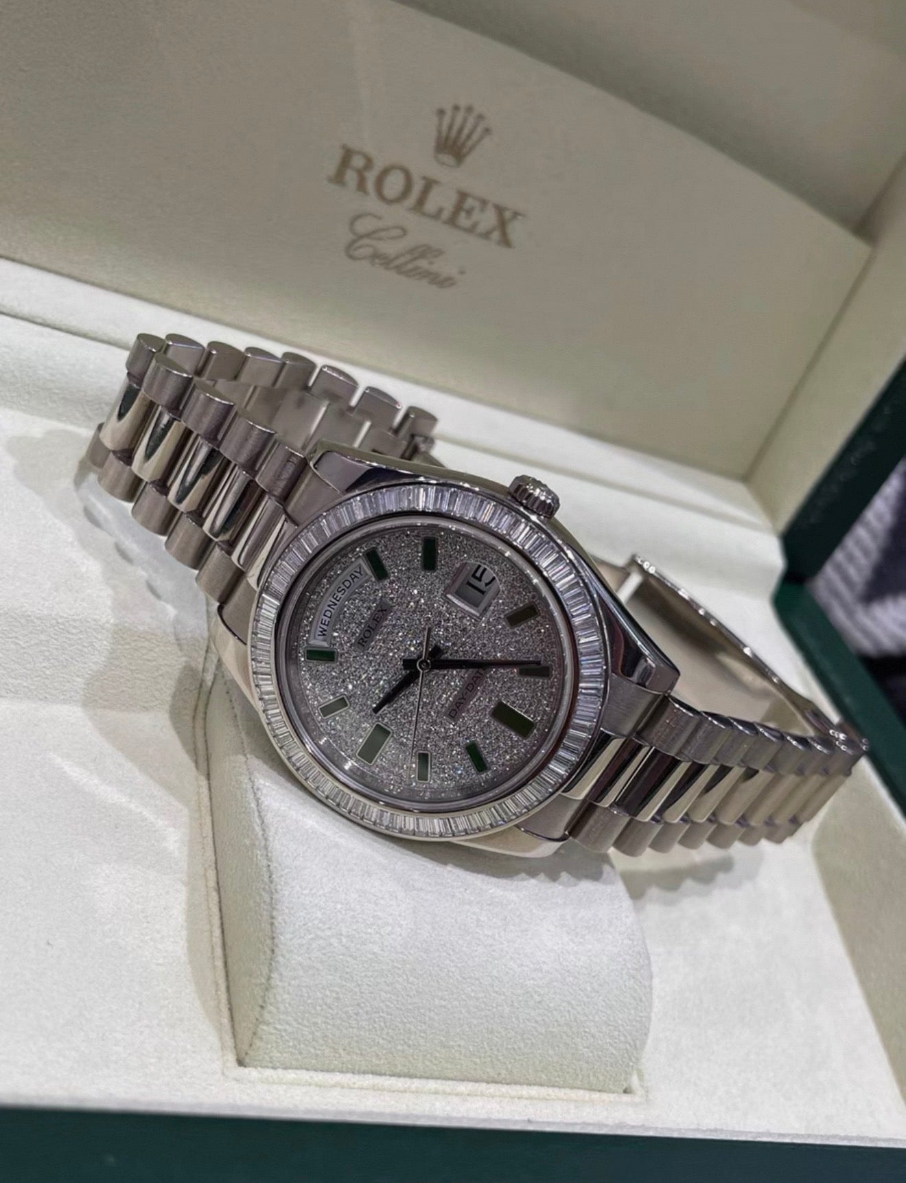 The Rolex Day-Date 218399T features an 18k white gold case with a diamond-encrusted bezel and green agate hour markers, enhancing visibility and elegance. Its automatic mechanical movement ensures precise timekeeping. With a diameter of 41mm, this VIP hidden edition is rare, making it a highly collectible timepiece.