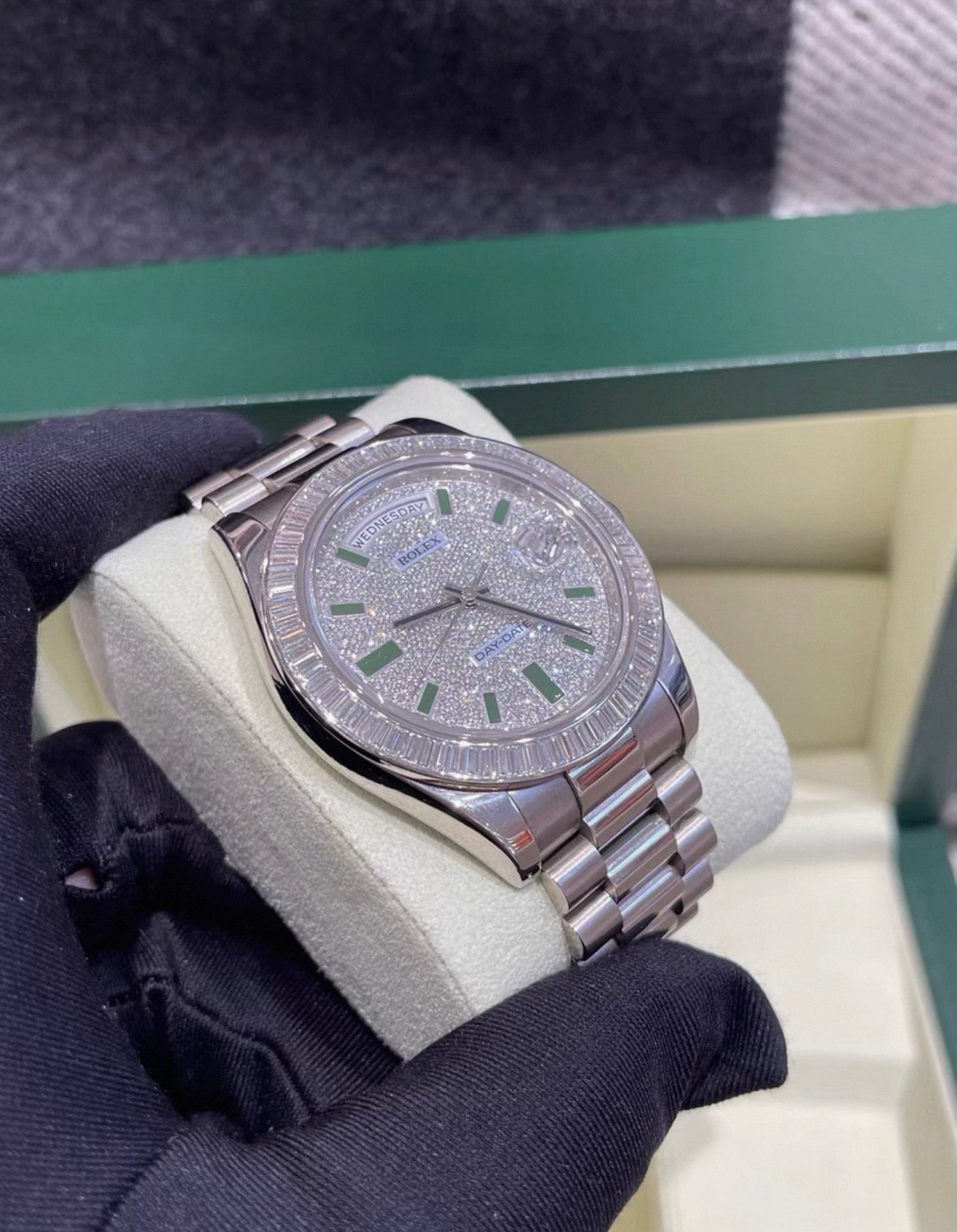 Rolex Day-Date 218399T 18k White gold pave diamond with green enamel